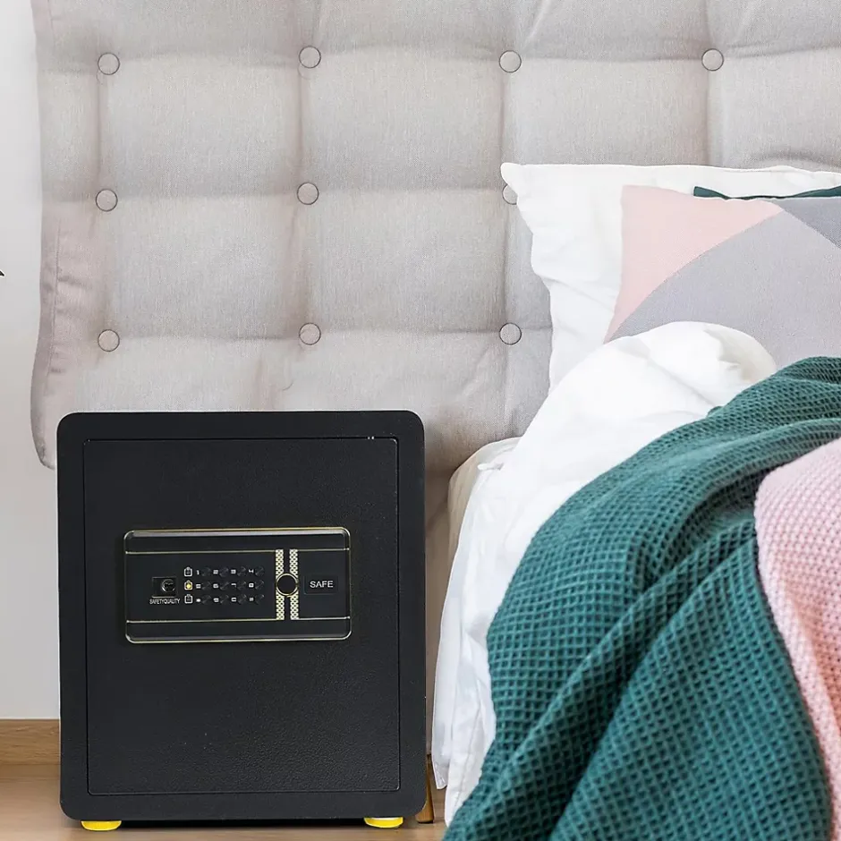 - Système d’alarme& Mot de passe anti-indiscrétion : Le coffre-fort domestique est doté d’un bon système d’alarme. 3 entrées erronées de mots de passe activeront le signal sonore d’avertissement. Il convient de noter que ce coffre-fort dispose également d’un mot de passe anti-indiscrétion, qui le protège des regards indiscrets malveillants.