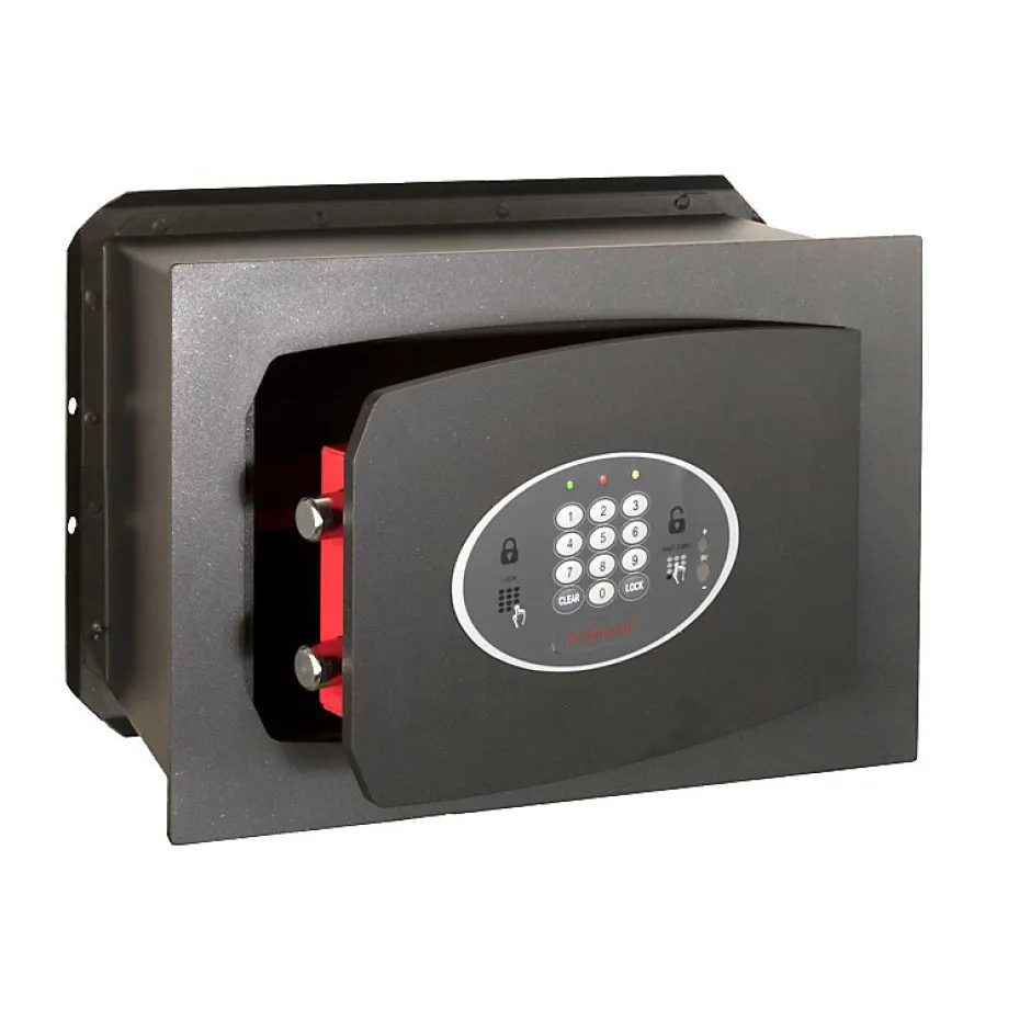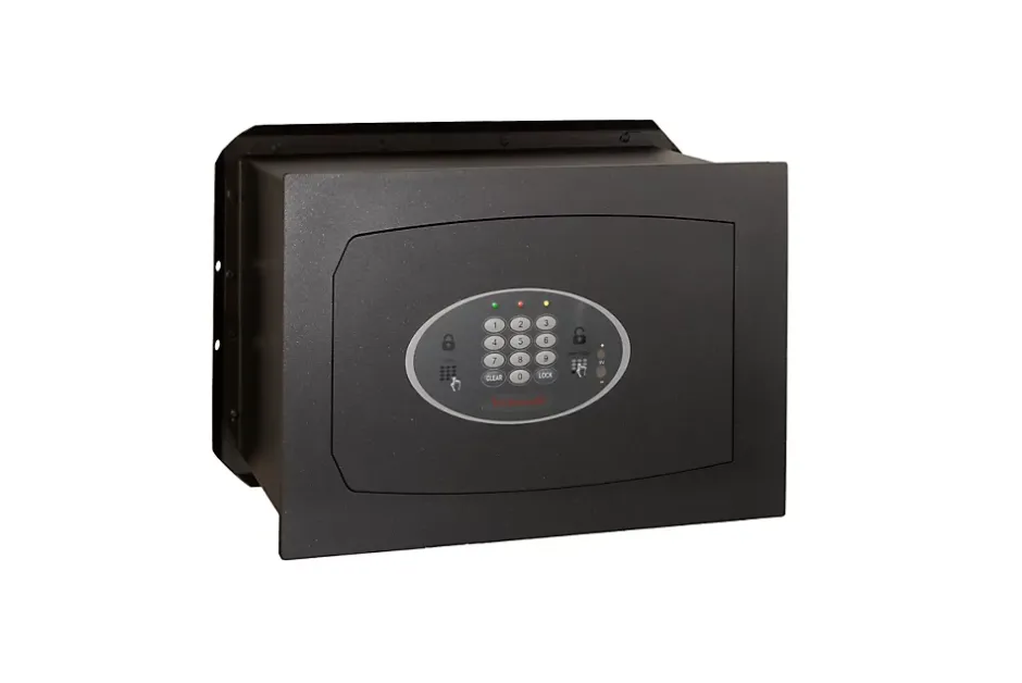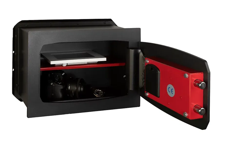 Serrure motorisée contrôlée par un système électronique à mémoire non volatile.Alimentation interne avec 4 piles de 1.5V AA. (non fournies).Alimentation de secours par contact extérieur sur le clavier.Secours par clé d’urgence (2 clés fournies).2 pênes horizontaux en acier nickelé Ø 18 mm.Ailettes d’ancrage anti-arrachement à l’arrière du coffre. Rajouter 6 cm en hauteur et 6 cm en largeur aux dimensions extérieures du coffre.Tablette intérieure amovible.Peinture époxy au four.Dimensions intérieures : H 24.5 x L 36.5 x P 14.5 cm