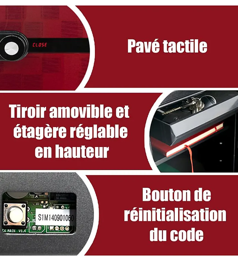 Coffre fort éléctronique ignifuge 1. H Volume 40. LCaractéristiques du coffre fort ignifuge FS-FM40 Reskal :Couleur : Noir, Rouge, Bleu, Gris et VioletMarque : ReskalModèle : FS-FM40Matière : AcierCoffre fort ignifuge (protection 1h)Ouverture à code avec clavier tactileCapacité : 40. LPoids : 60 kgDimension extérieur (Hx. Lx. P) : 510x410x445 mmDimension intérieur (Hx. Lx. P) : 415x305x320 mmEpaisseur porte et paroi : 70 mmFixation au sol1 Tiroir et 1 étagèreCertification SPDescription du coffre fort electronique anti feu 1. H Reskal :Le coffre-fort ignifuge 40. L de Reskal représente une solution de stockage sûre et pratique pour vos biens les plus précieux. Avec son ouverture à code avec clavier tactile et sa porte robuste de 70 mm d’épaisseur, il offre une protection optimale contre le feu. Sa capacité généreuse, son tiroir et son étagère internes permettent un rangement organisé, tandis que sa fixation au sol renforce sa sécurité. En choisissant ce coffre-fort, vous optez pour la tranquillité d’esprit et la protection de vos biens.