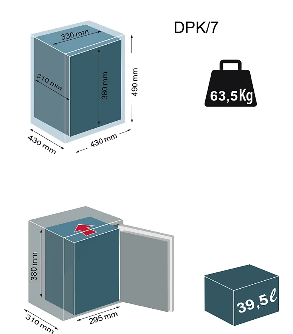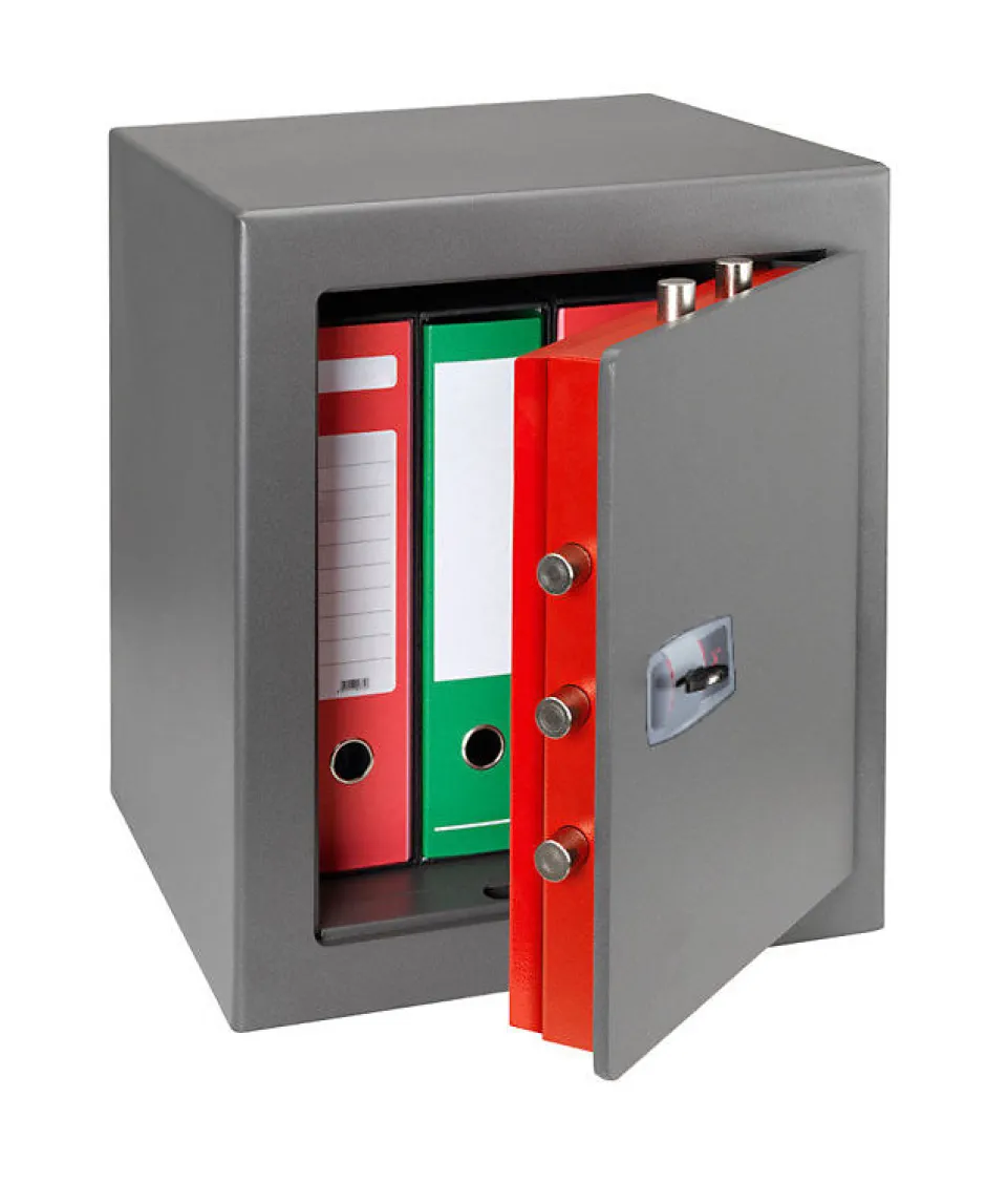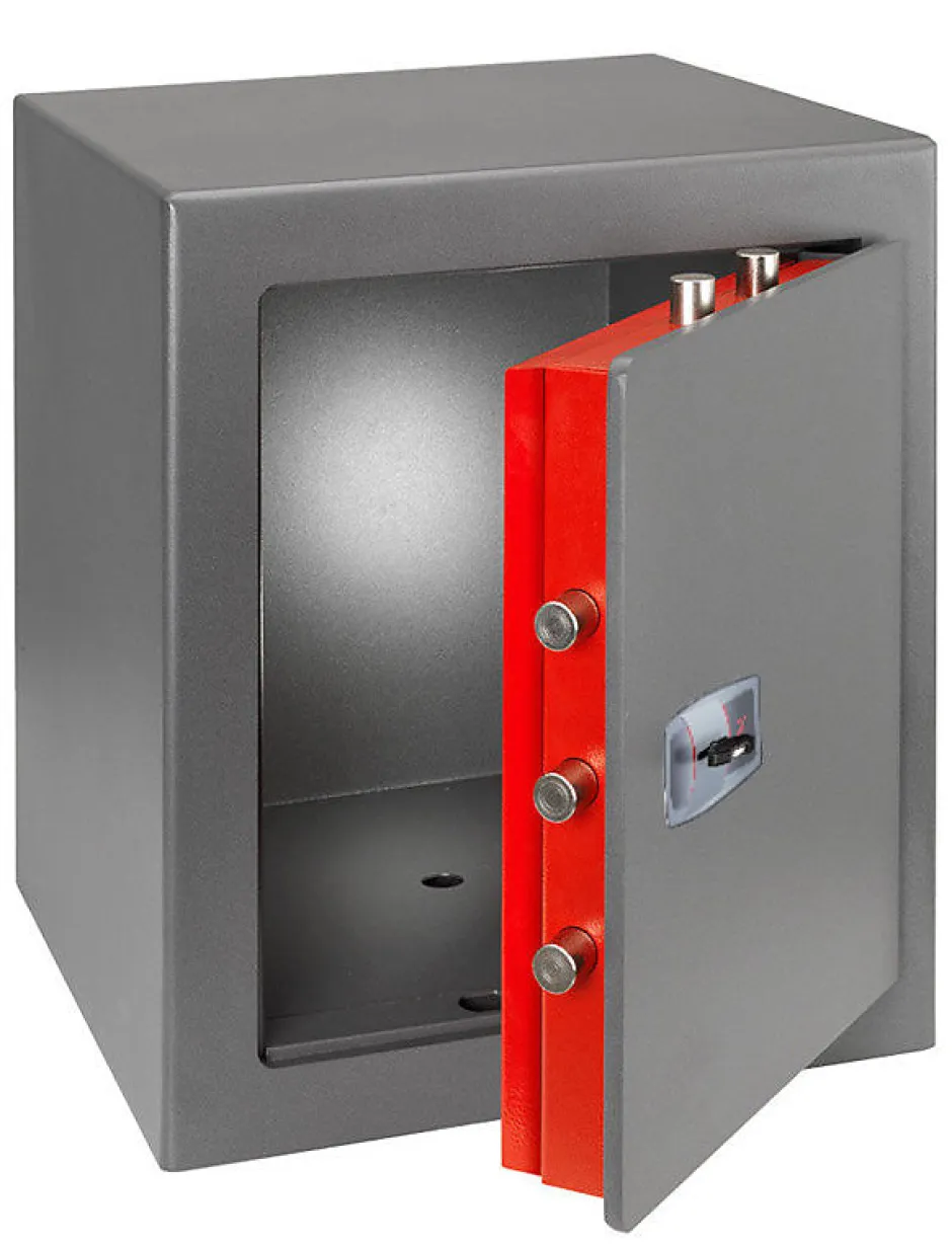 Coffre-fort certifié : 30 minutes contre le feu selon la Norme Européenne EN 15659 Résistance Grade LFS 30 PContre le vol selon la Norme Européenne EN 14450:18 Niveau de Sécurité S2.Serrure à clé double panneton.Cadre et porte en acier spécial monobloc d’épaisseur 10 mm, découpe laser.Corps en acier à double paroi : parois extérieures 3 mm. – parois intérieures 1.5 mm.Matériau ignifugé spécial entre les parois du corps et la paroi interne de la serrure.Serrure de haute sécurité de dernière génération à 8 gorges asymétriques et indépendantes certifiée EN 1300.Elle est basée sur l’utilisation de nouvelles gorges anti-crochetage oscillantes et de mentonnets à profil spécial qui opposent une résistance exceptionnelle aux attaques utilisant des systèmes sophistiqués de manipulation avec des rossignols spéciaux.Clé à double panneton avec profil spécial duplicable avec carte de propriété pour empêcher la reproduction non autorisée des clés.Clé prisonnière serrure ouverture.Pênes tournants anti-sciage en acier nickelé Ø 22 mm.Protection avec plaque d’acier au manganèse au niveau de la serrure.Soudures internes réalisées par un système robotisé.Soudure périmétrique continue cadre/corps.Tablette intérieure amovible.Trou de fixation au dos et à la base (1+1).Chevilles fournies.Peinture époxy au four.Fabriqué en Italie.Dimensions intérieures : H 38 x L 33 x P 31 cm