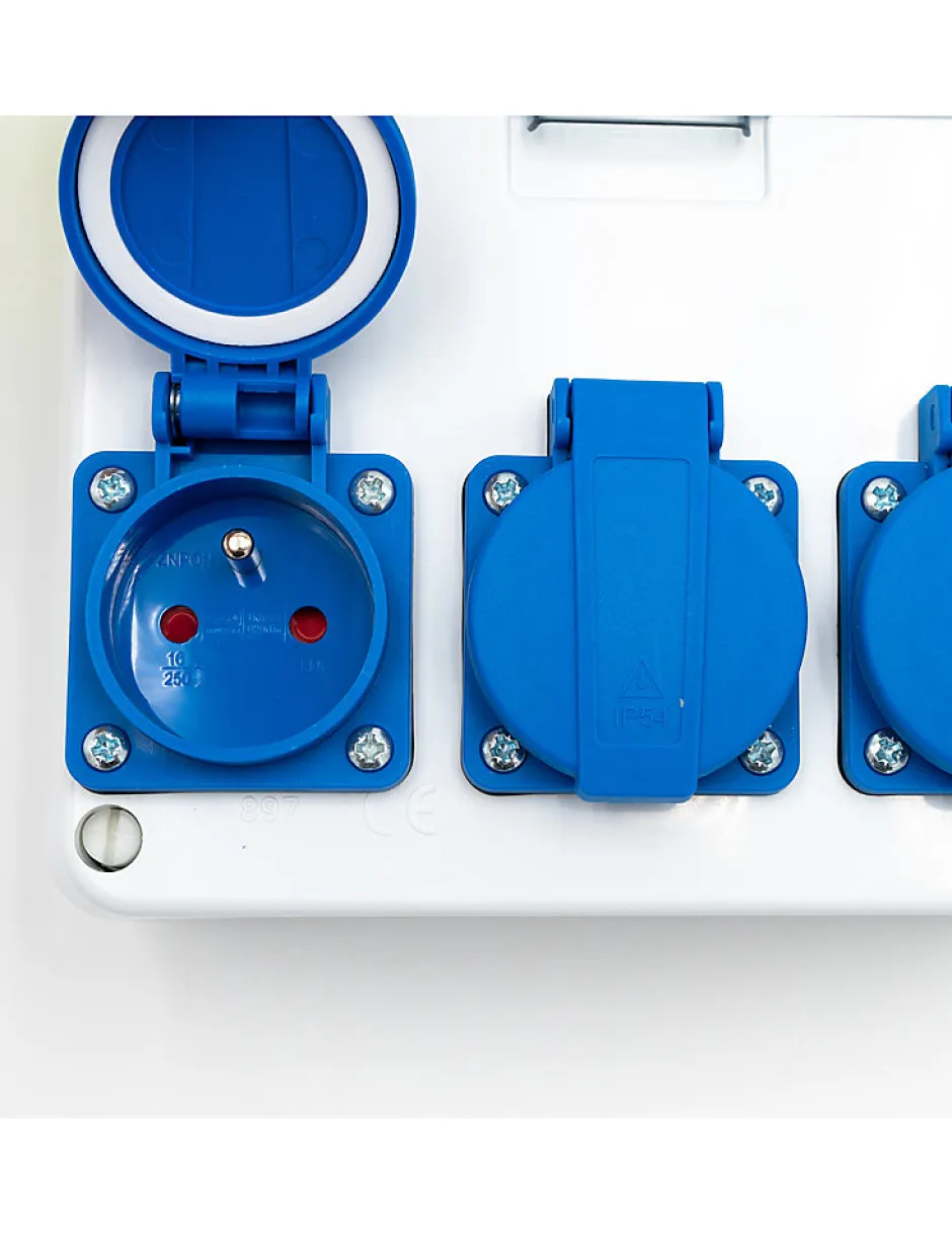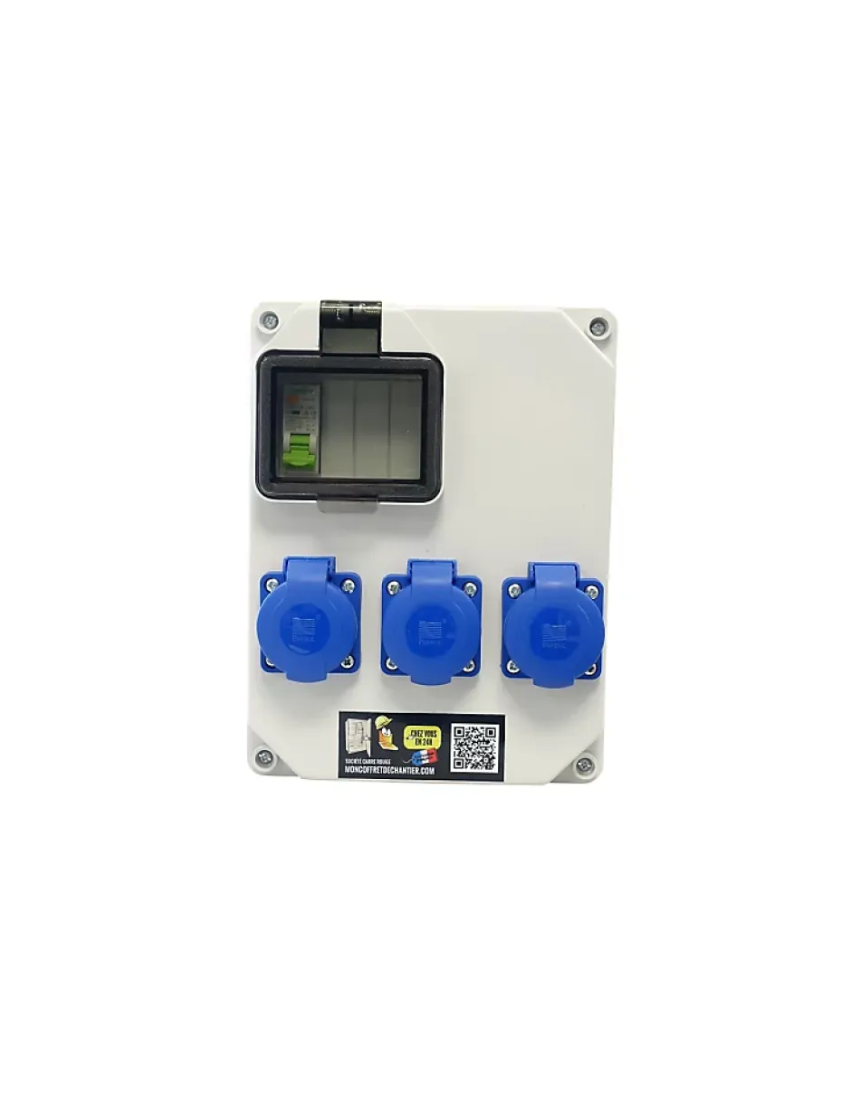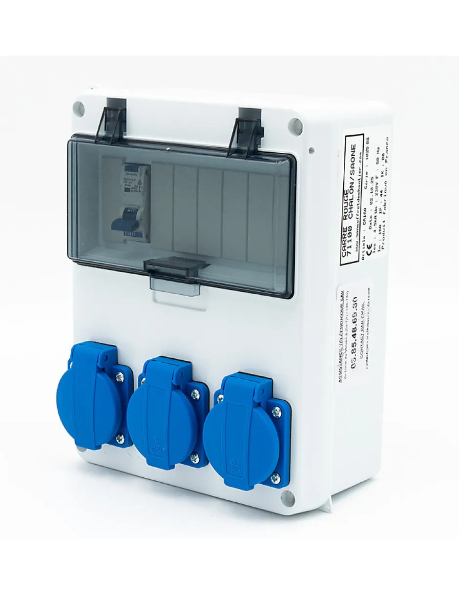 - Coffret de chantier/atelier équipé de 3 prises domestiques avec une protection par disjoncteur différentiel 16A .Son étanchéité le rend apte à une installation intérieure ou extérieure .