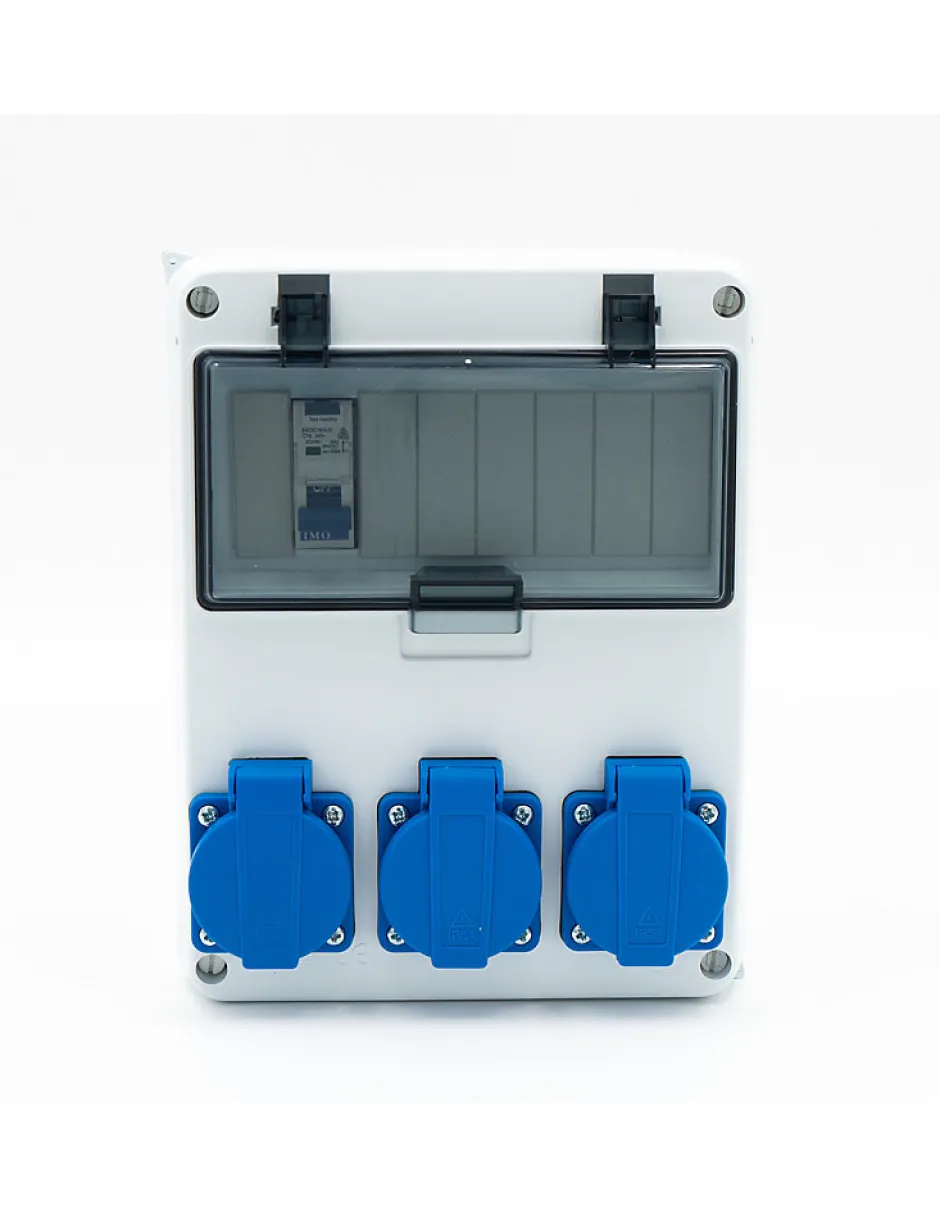 -enveloppe ABS 250x190x110 IP44 IK 08-8 modules-1 disjoncteur différentiel P/N 16A 30mA TAC 6kA-C-3 PC 16A P+N+T standard domestique IP54-1 bornier de terre-1 presse étoupe PG13.5 non montéProtection IMO Corp – coffret electrique de chantier Fabricant de coffret de chantier , standards ou sur mesures , fabrication et expédition à des vitesses records ! fabrication Française et livraison gratuite. Coffret de chantier ou atelier équipé de 3 prises 16A étanches : Coffret monophasé, . Coffret de chantier/atelier équipé de 3 prises domestiques avec une protection par disjoncteur différentiel 16A .Son étanchéité le rend apte à une installation intérieure ou extérieure .
