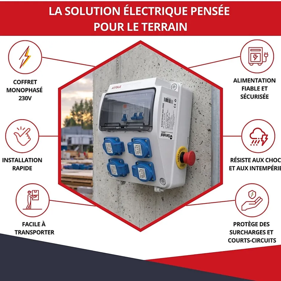 Coffret de chantier monophasé IP54 idéal pour alimenter en toute sécurité les équipements sur les chantiers nécessitant une alimentation fiable et protégée. Vérifiez attentivement les informations techniques de ce coffret pour assurer la compatibilité avec vos équipements. Idéal pour les chantiers ou évènements extérieurs pour alimenter en électricité tout type d’équipement standard. Avantages : ✅ Fabrication CE✅ Transportable✅ Résiste aux intempéries, environnements salins, UV✅ Indice de protection : IP54✅ Conforme aux normes de sécurité en vigueurCaractéristiques techniques : Monophasé Prises : 4 prises NF 2P+T – 50hZ – 16A NF – 250V Module : 9 Dimensions : H. 245 x L. 205 x P. 150 mm Couleur : RAL 7035 Poids : 2 kg Cable non fourni