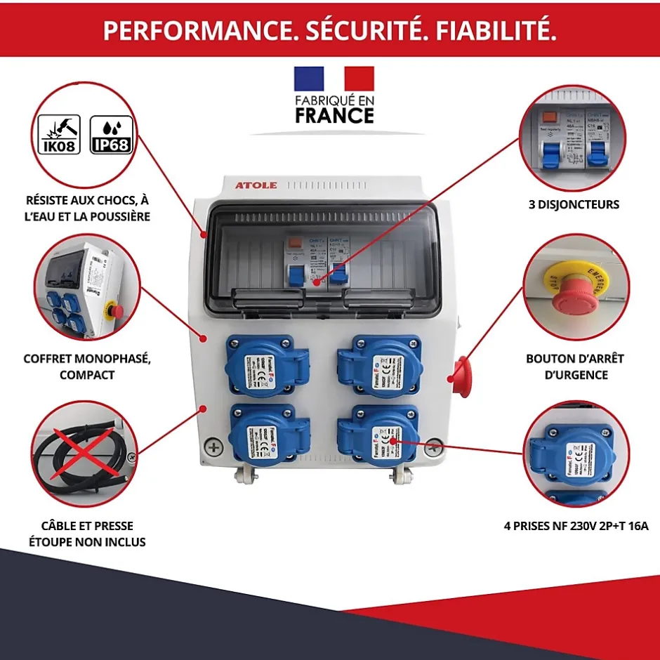 - Prises : 4 prises NF 2P+T – 50hZ – 16A NF – 250V
