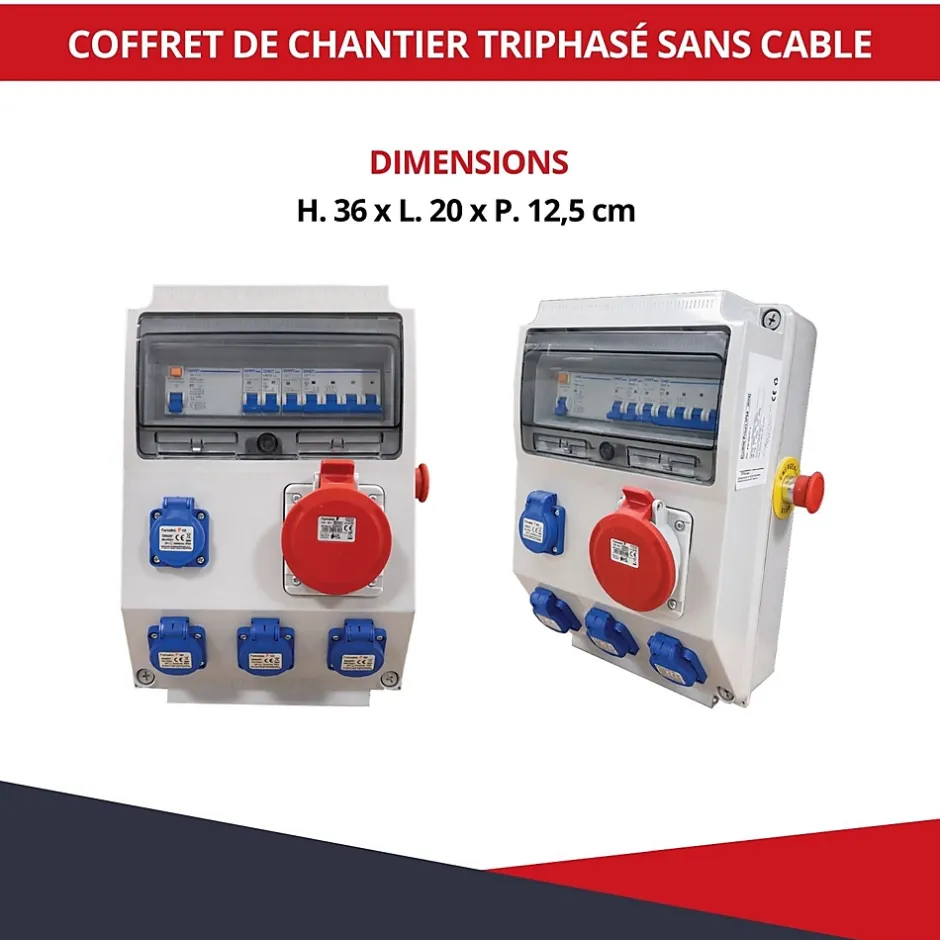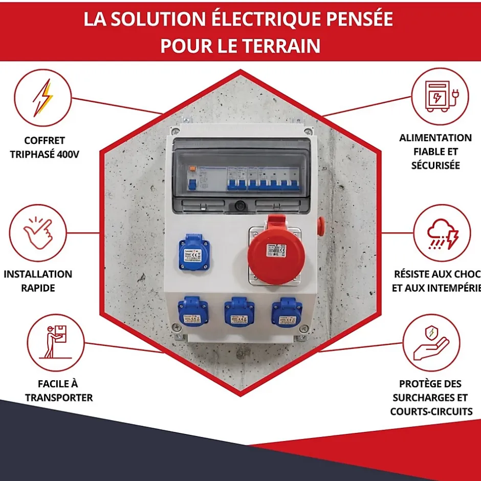 Coffret de chantier monophasé IP44 idéal pour alimenter en toute sécurité les équipements sur les chantiers nécessitant une alimentation fiable et protégée. Vérifiez attentivement les informations techniques de ce coffret pour assurer la compatibilité avec vos équipements. Idéal pour les chantiers ou évènements extérieurs pour alimenter en électricité tout type d’équipement nécessitant un système triphasé. Avantages : ✅ Fabrication CE✅ Transportable✅ Résiste aux intempéries, environnements salins, UV✅ Indice de protection : IP44✅ Conforme aux normes de sécurité en vigueurCaractéristiques techniques : Triphasé Prises : 4 prises NF 2P+T – 50Hz – 32A – 440V Module : 12 Dimensions : H. 360 x L. 205 x P. 125 mm Couleur : RAL 7035 Poids : 5 kg