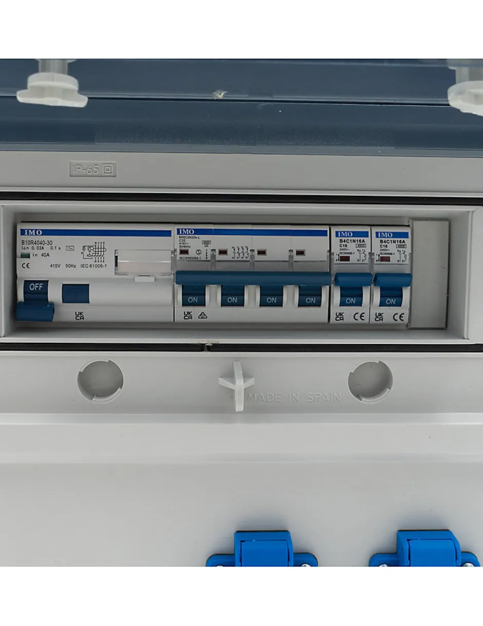-enveloppe ABS 410x305x150 IP 55 IK 08-interrupteur différentiel 4P 40A 30mA TAC-1 PC 32A 3P+N+T CEI-1 disjoncteur 4P 32A 6kA-C-6 PC 16A P+N+T standard domestique-2 disjoncteurs P/N 16A 4.5kA-C-bornier de terre – coffret electrique de chantier Coffret de prises 400 Volts de 6 prises mono et 1 prise trip 32A , livré sous 24 heures. Prix de gros sur coffrets de prises triphasés , fabrication Française : Coffret triphasé, coffret de prises triphasé. Coffret 7 prises triphasé 40A
