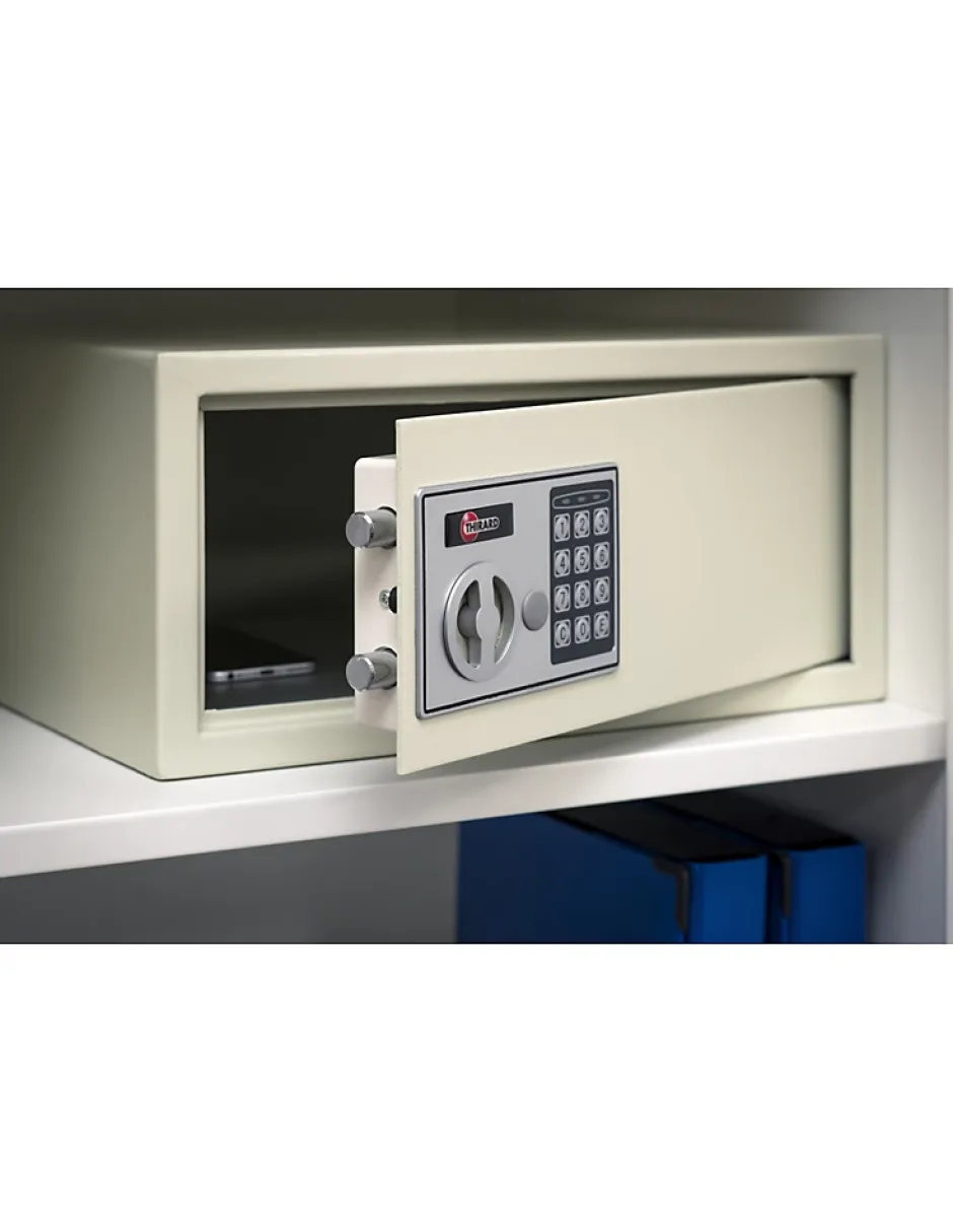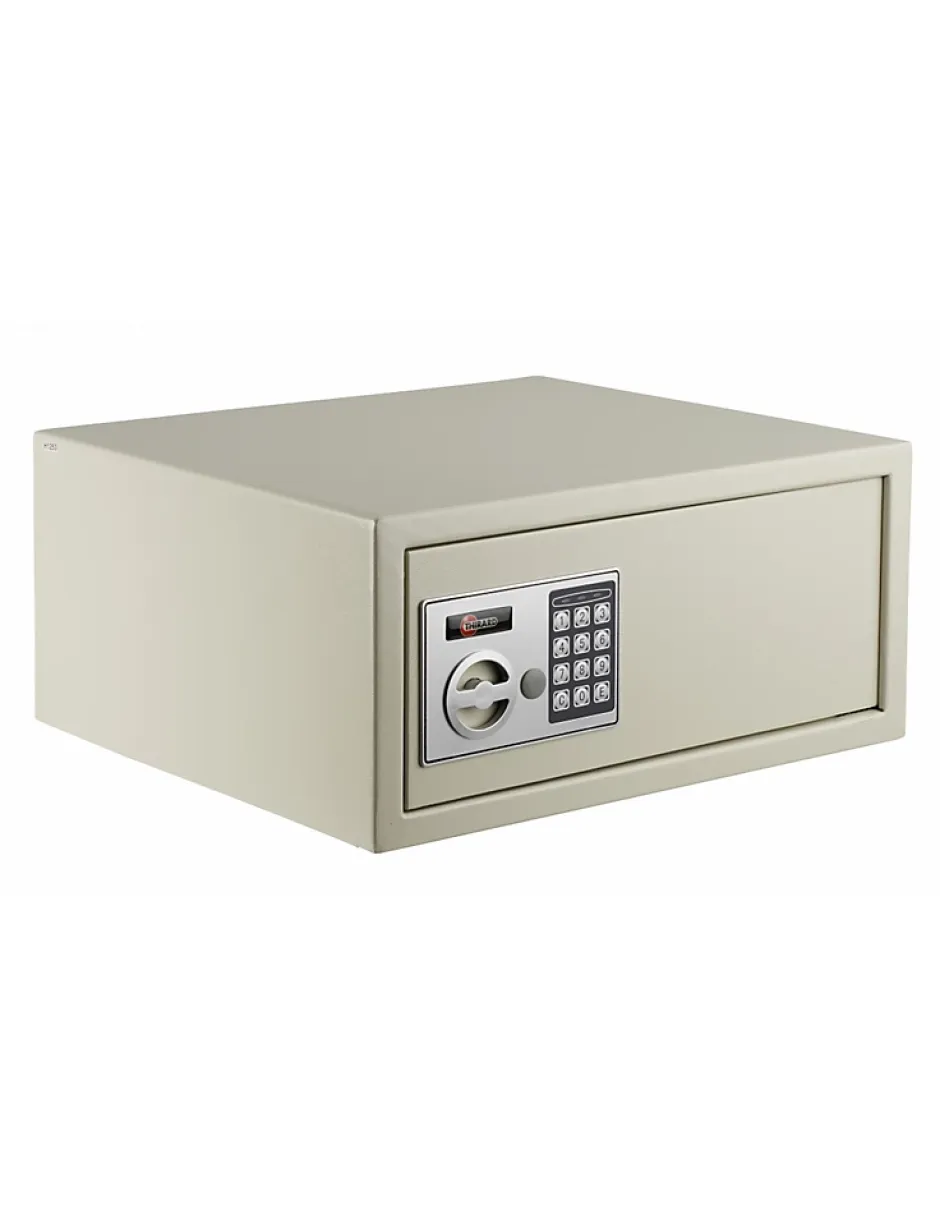 Le coffre VINCENNES protège vos documents, clés, argent et ordinateur portable grâce à une serrure électronique programmable, 2 pênes horizontaux de 16 mm et deux clés d’urgence fournies. Sa construction en acier manganèse, porte de 3 mm et corps de 1 mm, associée à la finition époxy beige, assure durabilité et résistance à la corrosion. Livré avec 4 piles LR6 et conçu pour une installation facile avec 4 trous de fixation, il offre une solution compacte et pratique pour sécuriser vos biens de valeur moyenne.