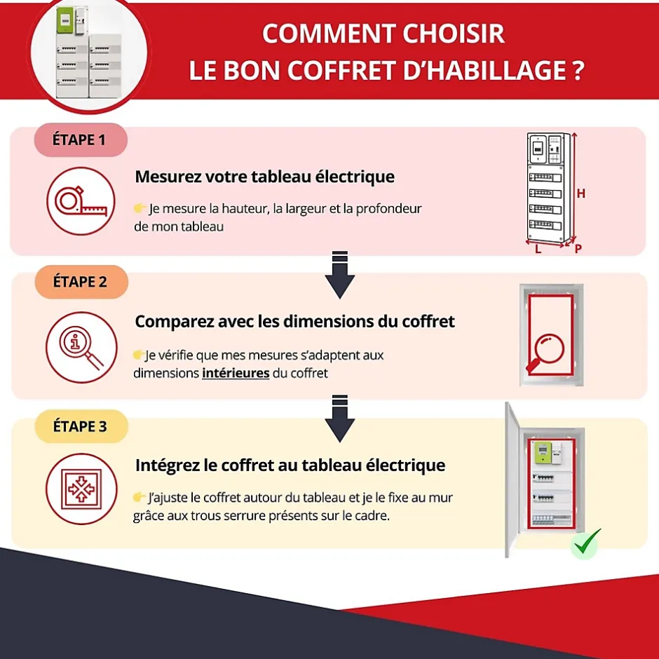 Le coffret d’habillage avec serrure à clef dissimule tout type d’appareillage électrique et convient à des installations en 1 travée. Il s’adapte à toute marque et à toute situation de chantier. Vérifiez attentivement les dimensions extérieures et intérieures pour assurer la compatibilité avec votre installation. Idéal pour les professionnels et les particuliers souhaitant un habillage discret et sécurisé pour leurs tableaux électriques !Avantages :✅ Fabrication 100% française✅ Coffret livré monté : installation rapide et facile✅ Prédécoupes intégrées (partie supérieure et inférieure) pour une gestion simplifiée des câbles et goulottes✅ Fermeture sécurisée à clé (2 clés fournies)✅ Matière recyclable : un produit conçu pour durer tout en respectant l’environnementCaractéristiques techniques : Dimensions extérieures (Hors-tout) : H. 920 x L. 340 x P. 140 mm Dimensions intérieures (utiles) : H. 860 x L. 268 x P. 125 mm Dimensions de prédécoupe pour goulotte : 102 x 52 mm / 102 x 63 mm / 152 x 63 mm Matière : tôle acier Couleur : peinture thermolaquée Blanc RAL9003 grain cuir Poids : 6,65 kg Intégration en partie supérieure et inférieure de prédécoupes.