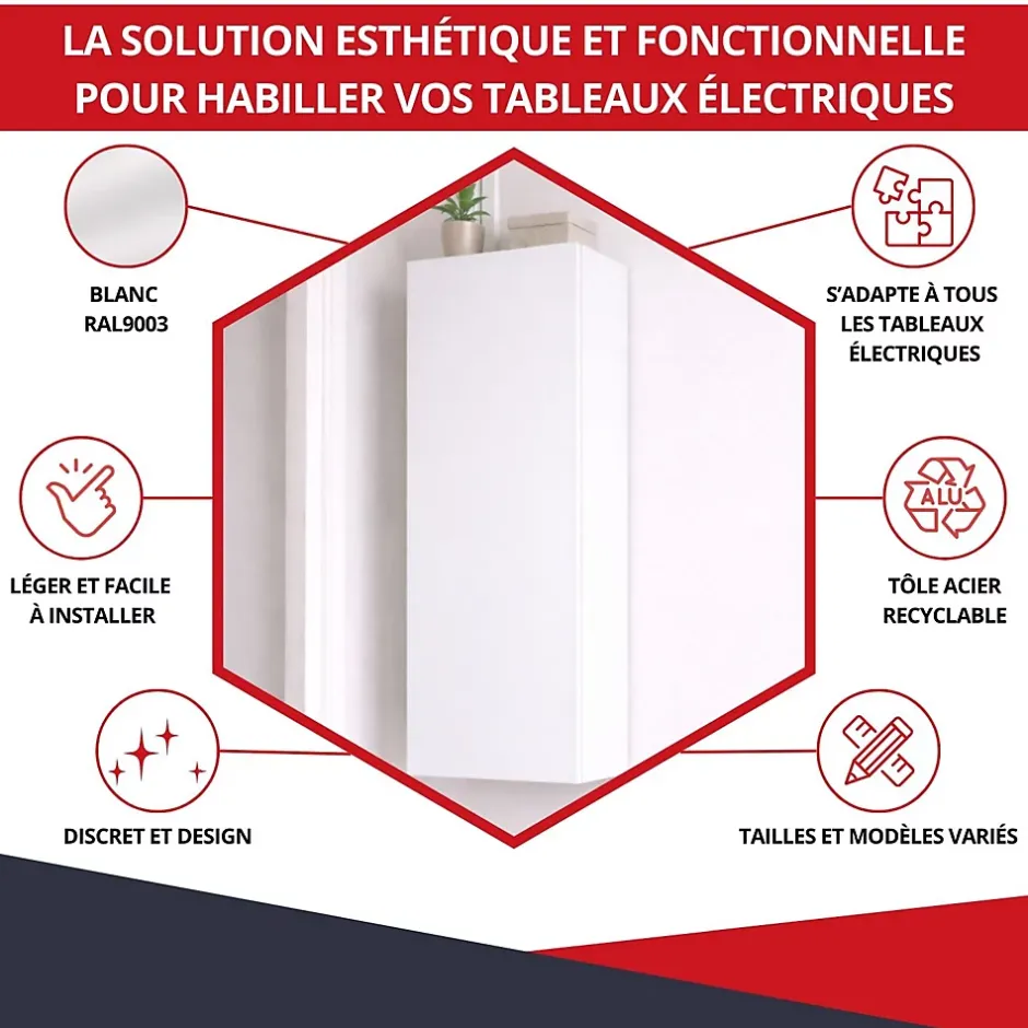 Le coffret d’habillage dissimule tout type d’appareillage électrique et convient à des installations en 1 travée. Il s’adapte à toute marque et à toute situation de chantier. Vérifiez attentivement les dimensions extérieures et intérieures pour assurer la compatibilité avec votre installation. Idéal pour les professionnels et les particuliers souhaitant un habillage discret et sécurisé pour leurs tableaux électriques !Avantages :✅ Fabrication 100% française✅ Coffret livré monté : installation rapide et facile✅ Prédécoupes intégrées (partie supérieure et inférieure) pour une gestion simplifiée des câbles et goulottes✅ Matière recyclable : un produit conçu pour durer tout en respectant l’environnementCaractéristiques techniques : Dimensions extérieures (Hors-tout) : H. 1040 x L. 340 x P. 140 mm Dimensions intérieures (utiles) : H. 980 x L. 268 x P. 125 mm Dimensions de prédécoupe pour goulotte : 102 x 52 mm / 102 x 63 mm / 152 x 63 mm Matière : tôle acier Couleur : peinture thermolaquée Blanc RAL9003 grain cuir Poids : 8 kg Intégration en partie supérieure et inférieure de prédécoupes.