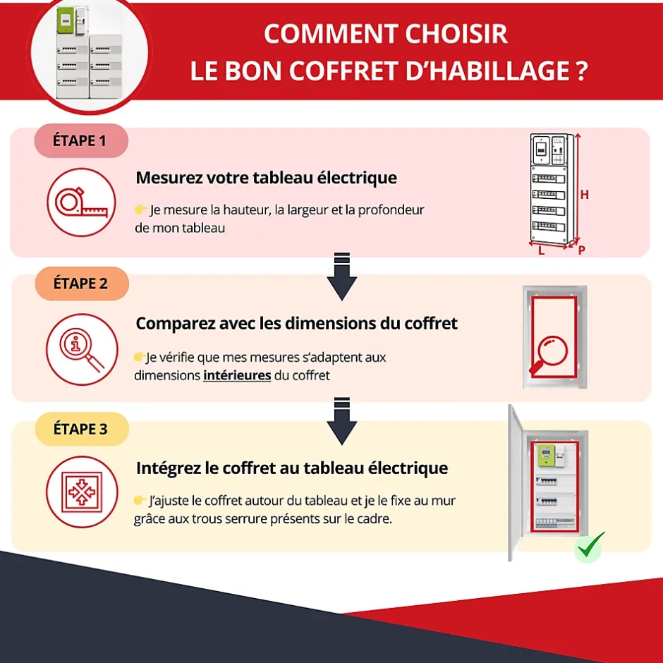 Le coffret d’habillage dissimule tout type d’appareillage électrique et convient à des installations en 1 travée. Il s’adapte à toute marque et à toute situation de chantier. Vérifiez attentivement les dimensions extérieures et intérieures pour assurer la compatibilité avec votre installation. Idéal pour les professionnels et les particuliers souhaitant un habillage discret et sécurisé pour leurs tableaux électriques !Avantages : ✅ Fabrication 100% française ✅ Coffret livré monté : installation rapide et facile ✅ Prédécoupes intégrées (partie supérieure et inférieure) pour une gestion simplifiée des câbles et goulottes ✅ Matière recyclable : un produit conçu pour durer tout en respectant l’environnementCaractéristiques techniques : Dimensions extérieures (Hors-tout) : H. 670 x L. 340 x P. 140 mm Dimensions intérieures (utiles) : H. 610 x L. 268 x P. 125 mm Dimensions de prédécoupe pour goulotte : 102 x 52 mm / 102 x 63 mm / 152 x 63 mm Matière : tôle acier Couleur : peinture thermolaquée Blanc RAL9003 grain cuir Poids : 4,6 kg Intégration en partie supérieure et inférieure de prédécoupes.