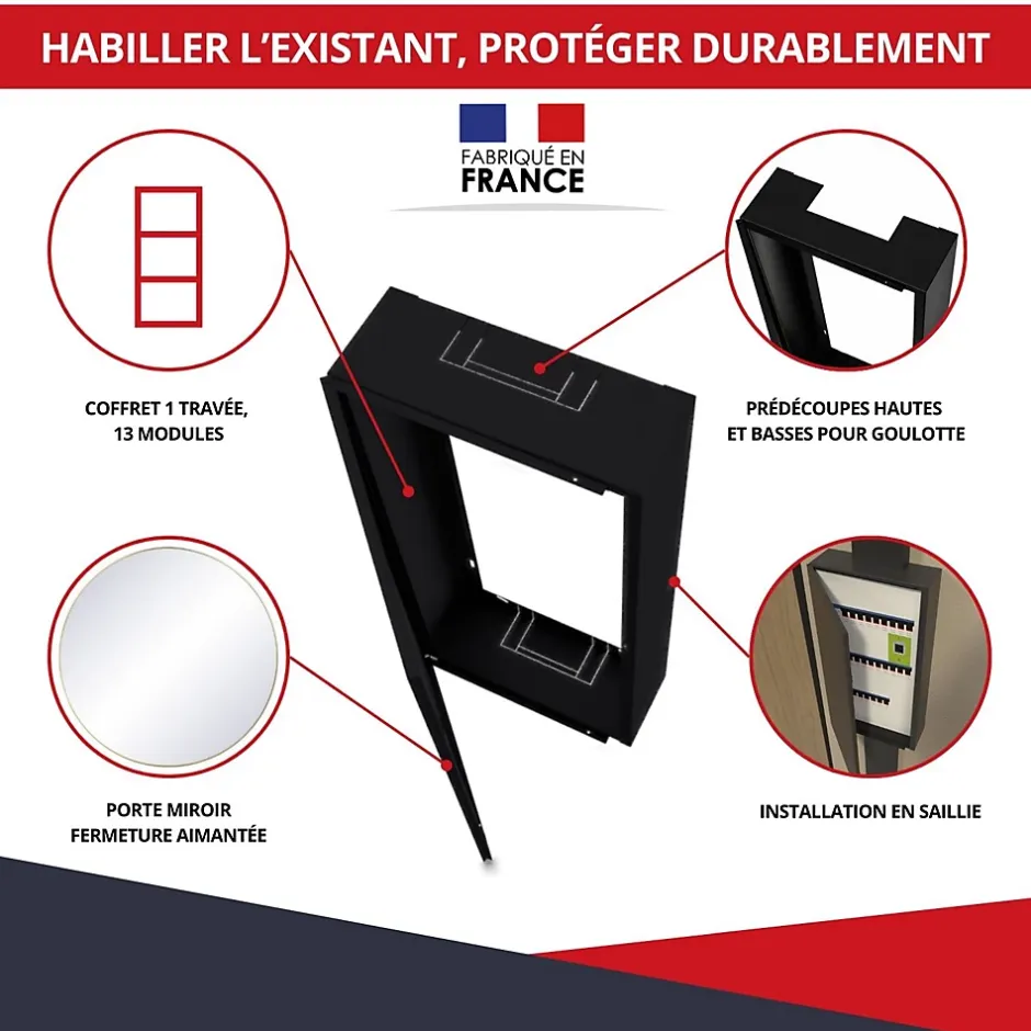 Le coffret d’habillage mirroir augmente l’esthétique de votre installation électrique même dans le cadre de la rénovation. Il dissimule tout type d’appareillage électrique et convient à des installations en 1 travée. Il s’adapte à toute marque et à toute situation de chantier. Vérifiez attentivement les dimensions extérieures et intérieures pour assurer la compatibilité avec votre installation. Idéal pour les professionnels et les particuliers souhaitant un habillage discret et sécurisé pour leurs tableaux électriques !Avantages :✅ Fabrication 100% française✅ Coffret livré monté : installation rapide et facile✅ Prédécoupes intégrées (partie supérieure et inférieure) pour une gestion simplifiée des câbles et goulottes✅ Porte Miroir intégrée ✅ Matière recyclable : un produit conçu pour durer tout en respectant l’environnementCaractéristiques techniques : Dimensions extérieures (Hors-tout) : H. 790 x L. 340 x P. 145 mm Dimensions intérieures (utiles) : H. 730 x L. 268 x P. 135 mm Dimensions de prédécoupe pour goulotte : 102 x 53 mm / 102 x 63 mm / 152 x 63 mm Matière : tôle acier Couleur : peinture thermolaquée grain cuir Noir Poids : 9,80 kg Intégration en partie supérieure et inférieure de prédécoupes.