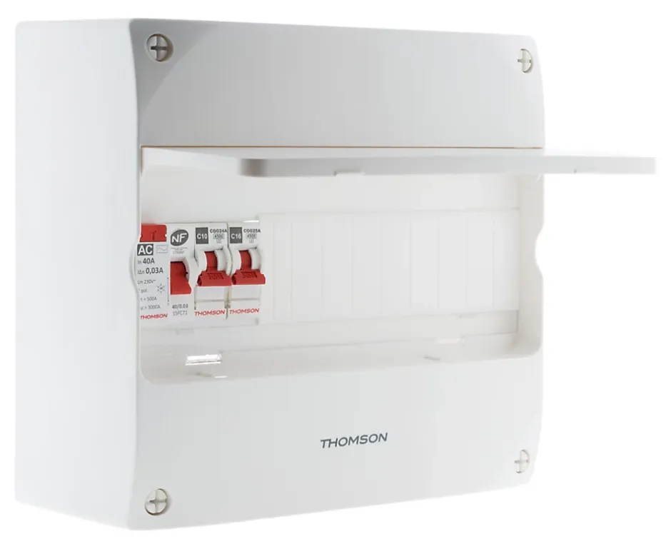 Caractéristiques du coffret électrique pré-équipé 1 rangée 13 modules – Thomson :Modèle : coffret électrique pré-équipéCouleur(s) : blancNombre de rangées : 1Nombre de modules : 13Montage facile sur Gaine Technique de Logement (GTL) ou directement sur le murCompatible GTL toutes marques3 cm d’espace libre à l’arrière du rail DIN pour un câblage accessibleOuverture/fermeture par 4 vis 1/4 de tour imperdables13 modules par rangéeTenue au fil incandescent 650°cBorniers neutre et phase 5 connexionsNorme(s) : NFC15-100Accessoires : 2 disjoncteurs : 1x 10A, 1x 16A1 interrupteur différentiel 40A type AC3 borniers (phase, neutre et terre)1 porte de protectionAide au montage : Tableaux livrés avec étiquettes et porte étiquettesPictogrammes pour identification des circuitsSchéma de câblageNotice explicative et gabarit de poseCe tableau électrique pré-équipé 1 rangée couvre l’ensemble des besoins d’une installation électrique domestique !Son design sobre et discret lui permet de s’intégrer facilement au sein de tout type d’intérieur. Il dispose d’un large espace permettant un câblage aisé. Il est idéal pour la rénovation.Le coffret électrique pré-équipé est une solution idéale pour une installation rapide et efficace dans les logements. Il offre une capacité de 13 modules sur une rangée, ce qui en fait un choix parfait pour les petits espaces.Compatible avec toutes les Goulottes Techniques de Logement (GTL), ce coffret peut être monté facilement sur GTL ou directement sur le mur, avec 3 cm d’espace libre à l’arrière du rail DIN pour un câblage simplifié. Son ouverture et sa fermeture sont facilitées par 4 vis imperdables 1/4 de tour, et il…