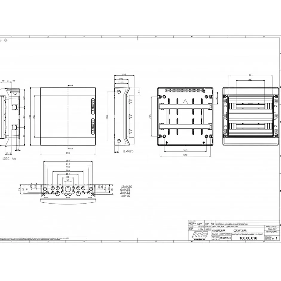 Coffret électrique étanches 36 modulesLe coffret CDN36PT2F fabriqué par IDE appartient à la gamme ECOLOGY. Cette gamme de coffret garantie une étanchéité IP65 permettant l’installation du coffret en extérieur.Sa porte transparente en polycarbonate permet d’apporter une grande robustesse au coffret. il dispose d’un indice de résistance aux chocs IK08.Ce coffret modulaire étanche permet d’intégrer 36 modules répartis sur 2 rangées.Bornier de terre à commander séparément ref 22004Ce coffret dispose d’une tenue au fil incandescent de 650°C2 Rails DIN permettant l’ajout de 18 modules de 18mmPorte transparente en polycarbonate2 serrures avec système de fermeture à pression. Serrure a clé ref 92150 disponible en optionEntrées de câbles pré découpéesDimensions : 436x418x148mmEntraxe inter rail DIN : 150mmLes plus du coffret CDN36PT2F – IDE ECOLOGYRésiste aux UVPeut être jumelé avec un coffret de la gamme STARLa gamme ECOLOGY propose des coffrets de 4 à 54 modules