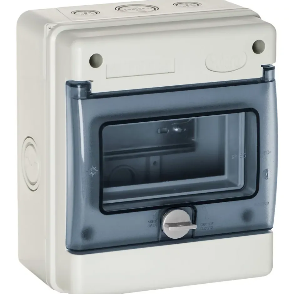 Coffret électrique industriel. Couleur(s) : gris. Installation rapide : pré-perforé (latéral, supérieur et inférieur). Avec vis inox pour une fermeture ultra rapide. Barrettes de terre et neutre incluses. Indices de protection : IP65, IK08. Avec 4,6,8 ou 12 modules. Dimensions : 4 modules : 120 x 200 x 115mm, 6 modules : 170 x 200 x 115mm, 8 modules : 215 x 200 x 115mm, 12 modules : 270 x 250 x 160mm