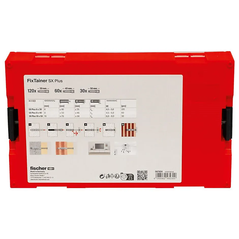 Coffret FixTainer chevilles SX Plus 6,8 / 10 FISCHER 567904 sans visLes coffrets FixTainer se clipsent entre pour un transport plus facile Le contenu est visible en un coup d’oeil grâce au couvercle transparent avec poignée intégrée Coffret de haute qualité refermable et rechargeable Quadruple expansion pour une charge optimale Ailettes de maintien de la vis pour un montage facilité La cheville s’installe sans effort La collerette empêche la cheville de glisser dans le forageCaractéristiques produit Coffret FixTainer chevilles SX Plus 6,8 / 10 FISCHER 567904 sans visLe coffret contient : 120x SX Plus 6×30 60x SX Plus 8×40 30x SX Plus 10x50Conditionnement : boite assortiment Quantité : 210 pièces