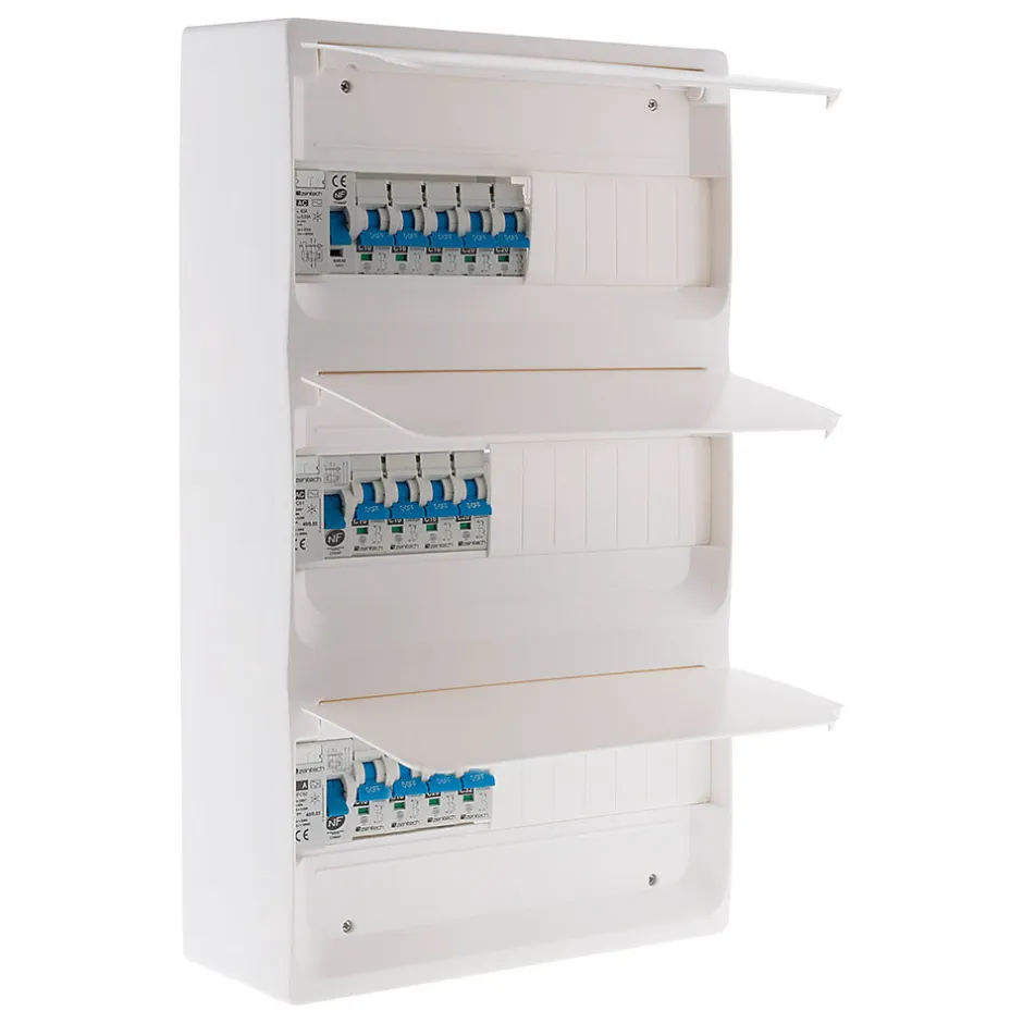 Caractéristiques du coffret électrique T5 – 39 modules + 13 disjoncteurs + 3 interrupteurs différentiels – Zenitech :Modèle : coffret électrique T5Compatible GTLCertifié NFC 15-100Idéal pour les logements T5Inclus: obturateurs, avec bornier de terre, portes, étiquettes de repérage des circuits & pictogrammesLivré avec 13 disjoncteurs : 3x10A5x16A4x20A1x32ALivré avec 3 interrupteurs différentiels :1x 30mA 63A Type AC1x 30mA 40A Type AC1x 30mA 63A Type ALe coffret électrique T5 est une solution complète et prête à l’emploi, idéale pour les installations électriques des logements conformes à la norme T5 !Compatible avec les Goulottes Techniques de Logement (GTL) et certifié NFC 15-100, il garantit une sécurité optimale et une installation aux normes françaises.Ce coffret inclut tous les éléments nécessaires pour une gestion simplifiée des circuits électriques, comme des obturateurs, un bornier de terre, des portes, des étiquettes de repérage des circuits et des pictogrammes pour un marquage clair.Il est livré avec 13 disjoncteurs préinstallés (3x10A, 5x16A, 4x20A, 1x32A) et 3 interrupteurs différentiels (1x 30mA 63A Type AC, 1x 30mA 40A Type AC, 1x 30mA 63A Type A) pour une protection efficace des circuits et des utilisateurs. Ce coffret est une solution fiable et pratique pour gérer et sécuriser l’alimentation électrique dans un logement.