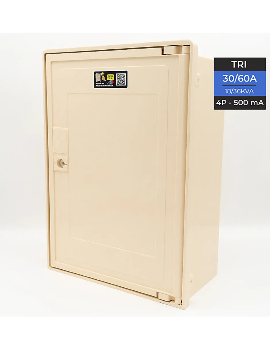Coffret triphasé base 30/60 AmpèresCoffret , complet et conforme aux normes NF-C 14-100/145-100 .Vous pourrez choisir dans la rubrique Caractéristiques techniques :- enveloppe coffret HN 62-S-20 – coffret coupe circuit tétrapolaire 60 Amp taille 00 plombable – panneau de fond – disjoncteur d’abonné différentiel tétrapolaire AGCP 30/60 500mA NF-C 62-411 plombable- interrupteur différentiel haute sensibilité tétrapolaire 63 Amp 30 mA- boîtier IP2X pour interrupteur différentiel- câblage en fil cuivre souple de section 16² avec embouts sertis- tension de 400 Volts- puissance maxi 60 ampères 12000 watts par phase ou 36 KWaLivraison gratuite sous 24 à 48 heures en point relais UPS si commande avant 15 heures ! – coffret electrique de chantier Coffret de chantier 400 Volts , direct fabricant , garantie de deux ans , prix imbattables. Coffret compteur de chantier triphasé 18/36KW 30/60 Ampères ERDF : Triphasé 18/36KW, coffret de chantier triphasé. Coffret triphasé d’une puissance réglable de 18 à 36 Kw (30/45/60 A) par phase sous une tension de 400 volts