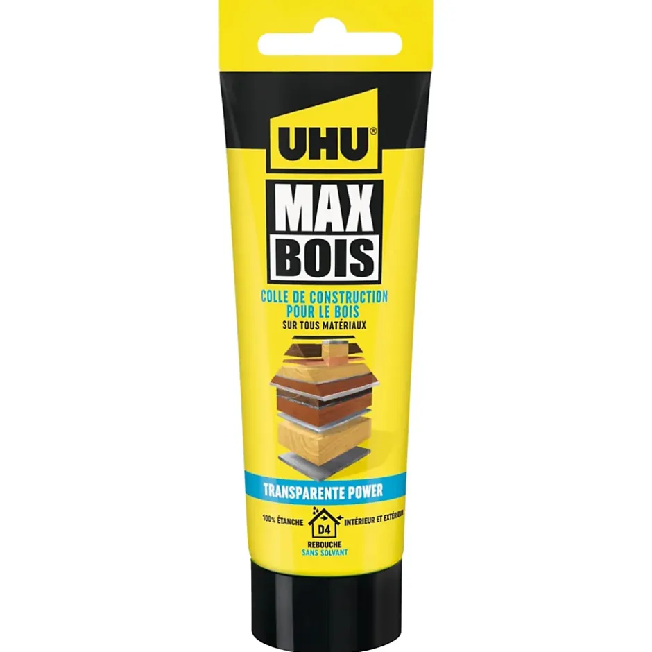 - UHU Max bois est notre nouvelle génération de colle à bois avec une formule novatrice brevetée ! Sans PU ni solvant elle est extrêmement forte, rapide, résistante à l’eau, idéale pour tous vos projets en intérieur comme en extérieur. Utilisable pour des collages bois sur bois ou bois avec d’autres matériaux de construction tel que le plâtre, la pierre, le bêton le métal et bien d’autres. Peut être poncée, peinte et lissée contrairement à une colle à bois classique. Utilisable sur tous les supports: régulier ou irrégulier, comble totalement jusqu’à 4 mm et ne goutte pas. Faites le bon choix avec UHU Max bois: la colle à bois qui fait tout!