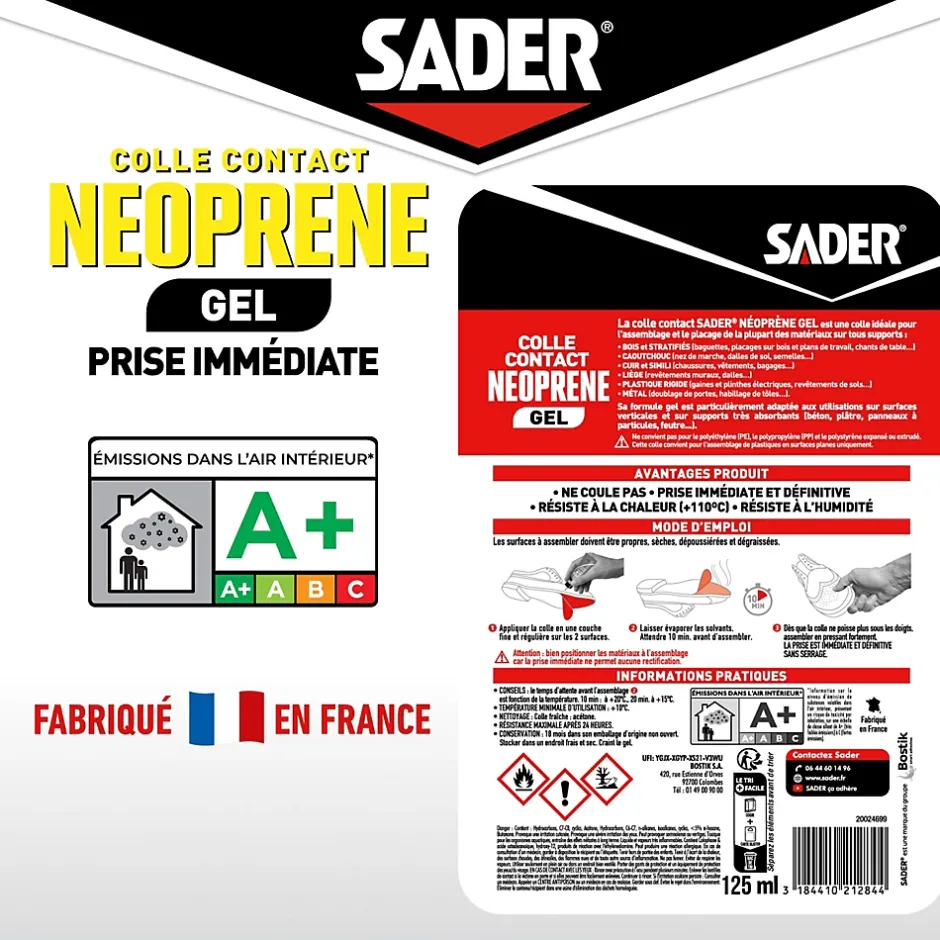 La Colle Contact Néoprène Gel de SADER est idéale pour l’assemblage et le placage de la plupart des matériaux sur tous supports en intérieur et extérieur sous abri : – Bois et Stratifiés : baguettes, placages sur bois et plans de travail, chants de table. – Caoutchouc : nez de marche, dalles de sol, semelles. – Cuir et Simili : chaussures, vêtements, bagages. – Liège : revêtements muraux, dalles. – Plastique rigide : gaines et plinthes électriques, revêtements de sols. – Métal : doublage de portes, habillage de tôles.