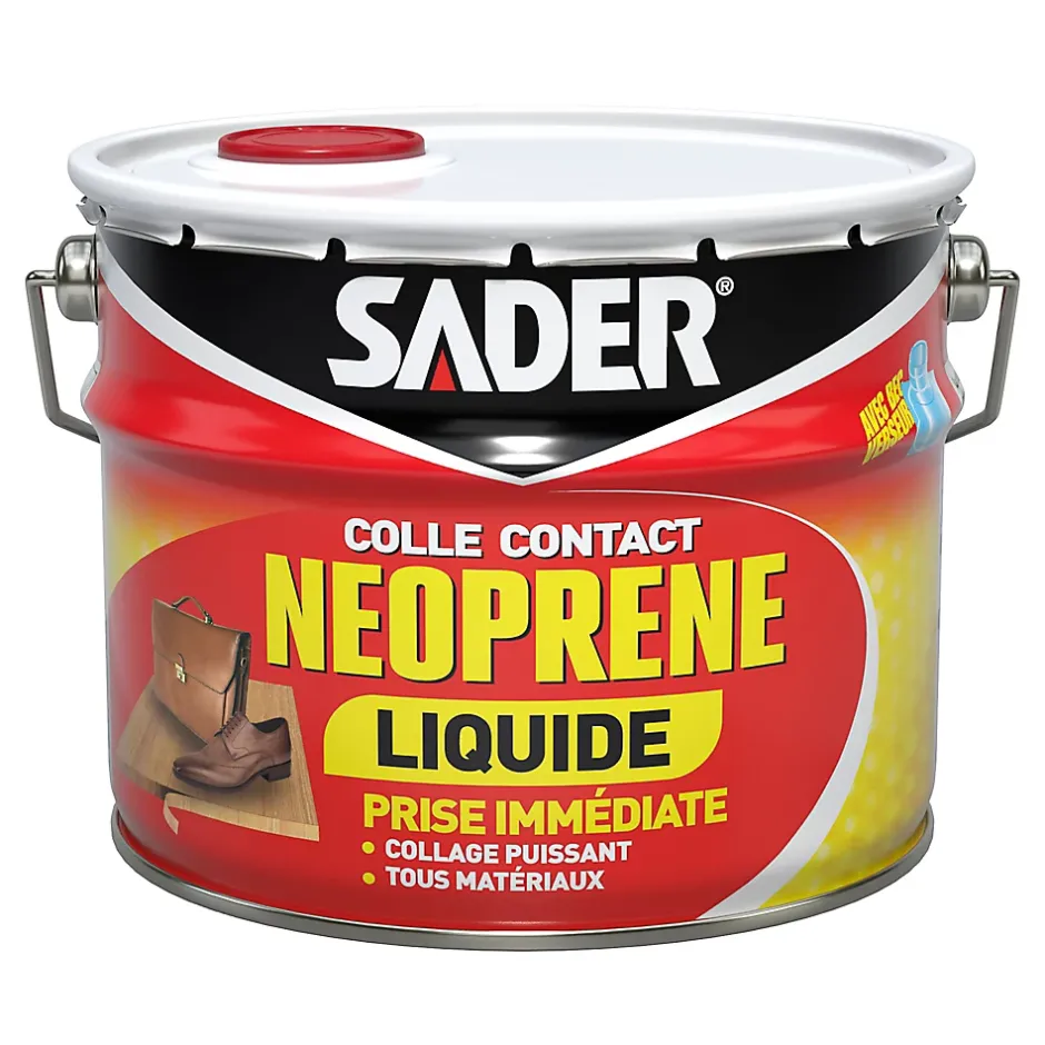 La Colle Contact Néoprène Liquide de SADER est idéale pour l’assemblage et le placage de la plupart des matériaux sur tous supports en intérieur et extérieur sous abri : – Bois et Stratifiés : baguettes, placages sur bois et plans de travail, chants de table. – Caoutchouc : nez de marche, dalles de sol, semelles. – Cuir et Simili : chaussures, vêtements, bagages. – Liège : revêtements muraux, dalles. – Plastique rigide : gaines et plinthes électriques, revêtements de sols. – Métal : doublage de portes, habillage de tôles.