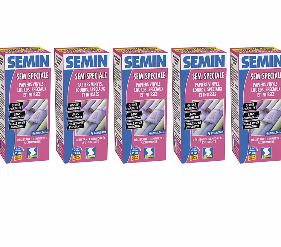 Ce pack contient :Sem-Spéciale, colle en poudre pour papiers peints vinyls et intissés, 5 boites de 200 gDESCRIPTION DU PRODUITColle cellulosique renforcée à la résine pour le collage des intissés à peindre ainsi que tous les papiers peints :Normaux (courants, épais…)Vinyls (plats ou expansés)Spéciaux (à peindre, lourds…)AVANTAGESCollant élevéTransparente après séchageNe tâche pasIdéale pour les pièces humidesGrande facilité d’homogénéisationColle adaptée à une utilisation en machine à encollerSUPPORTS ADMISPlaques de plâtre, carreaux de plâtre, béton ou enduit ciment, plâtre.COMPOSITION ET ASPECTLa colle SEM-SPECIALE se présente en poudre.CONDITIONNEMENTBoîte de 200 g.ACCESSOIRES COMPLÉMENTAIRESMachine à encoller si application mécanique.RENDEMENT200 g pour 5 rouleaux.