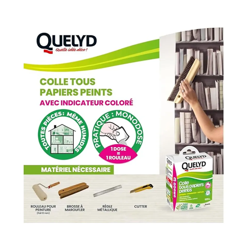 La colle à papier peint Quelyd est spécialement formulée pour garantir une application précise et un collage optimal. Son indicateur coloré, qui passe du rose à l’application au clair au séchage, vous permet de voir exactement où la colle a été posée, éliminant tout risque d’oubli et assurant une couverture uniforme sur vos murs.