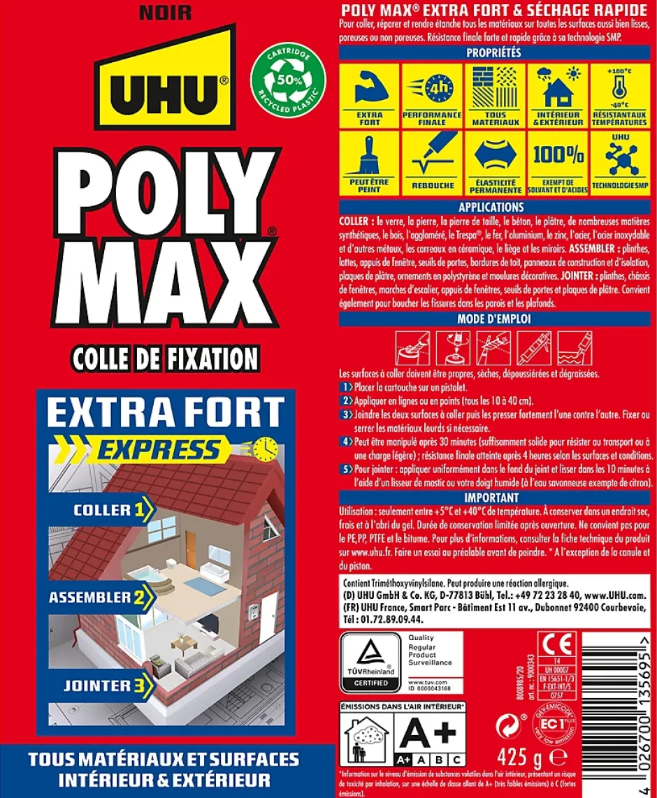 La colle mastic extra forte UHU Poly max noir 425g est la solution idéale pour fixer, assembler et étanchéifier rapidement et durablement tous types de matériaux, en intérieur comme en extérieur. Grâce à sa technologie MSP, elle offre une prise finale ultra résistante en seulement 4 heures. Sa formule extra forte adhère parfaitement, même sur des supports humides, lisses ou poreux. Polyvalente, elle convient aux surfaces les plus diverses : bois, métal, pierre, plastique, carrelage… Étanche, résistante à l’eau, aux UV, aux intempéries et aux températures extrêmes (-40 °C à +100 °C), elle reste élastique dans le temps, sans rétrécir. Sans solvant ni acide, inodore, et peut être peinte après séchage, elle garantit un travail propre, durable et soigné. Sa canule refermable et son capuchon anti-obstruction assurent une application facile et une bonne conservation. Prête à l’emploi avec un pistolet à cartouche, elle est parfaite pour tous vos travaux de bricolage, d’aménagement et de rénovation. Avec UHU MSP, vous optez pour une adhérence immédiate, une tenue longue durée et un résultat professionnel.