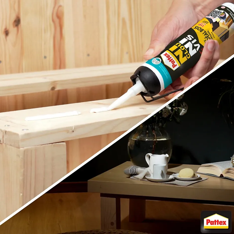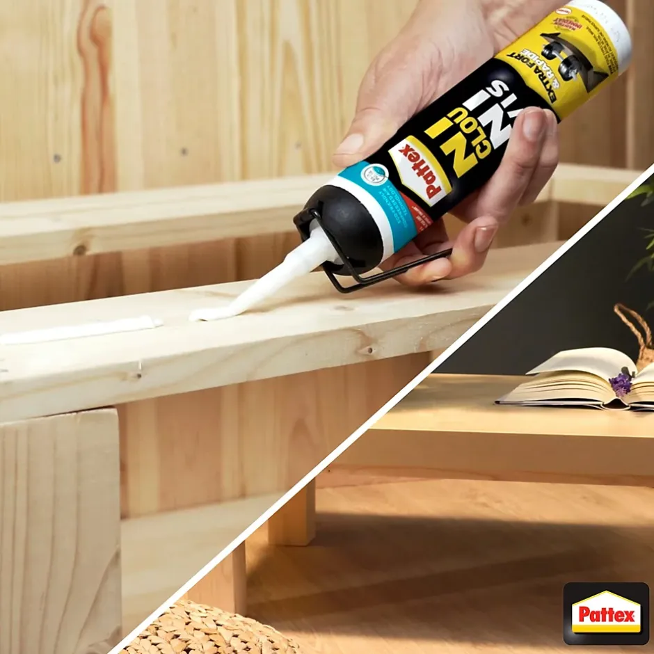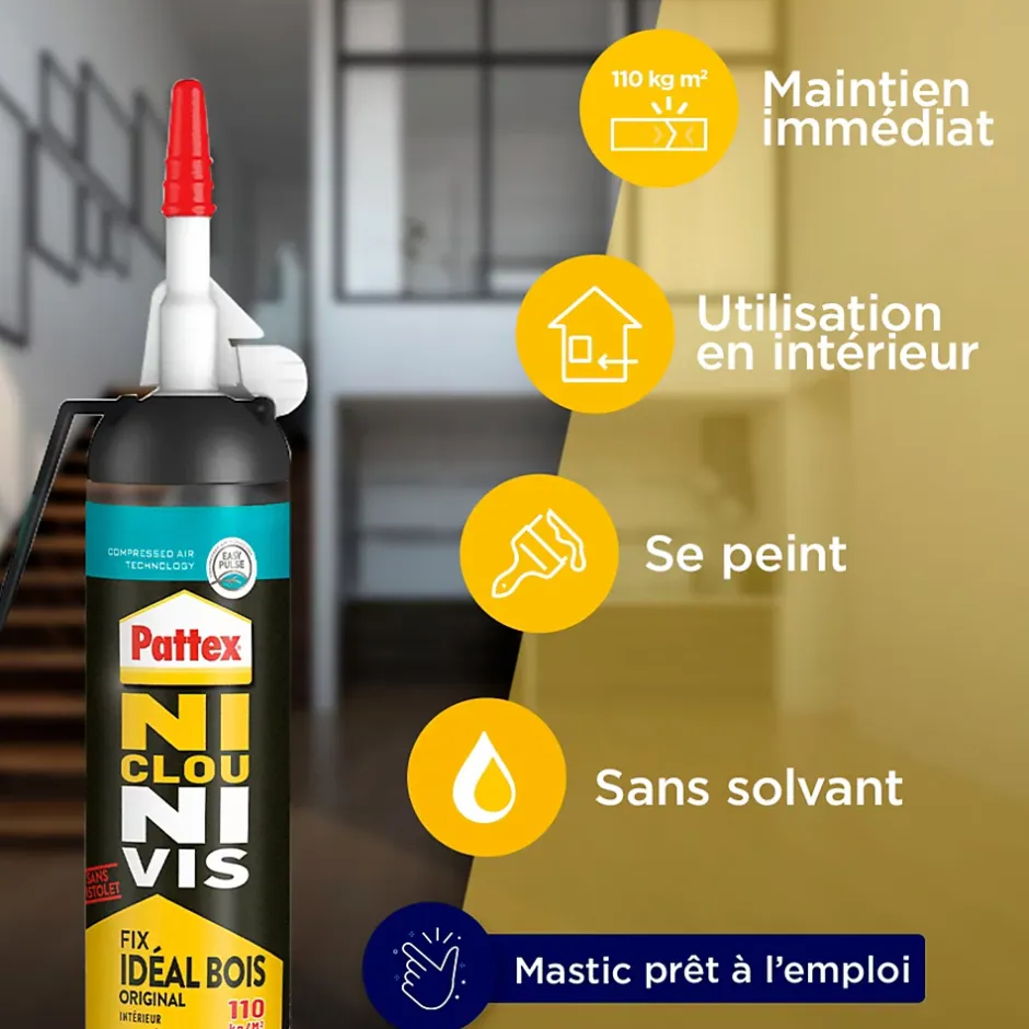 Pattex Colle de Fixation Ni Clou Ni Vis Fix Idéal Bois est une colle conçue pour un résultat fiable et rapide, sans percer. Pour des travaux en intérieur, pour un collage sur mur ou plafond, la colle de fixation Pattex Ni Clou Ni Vis Fix Idéal Bois vous assure une fixation puissante ! Cette colle sans solvant est idéale pour les matériaux poreux comme le bois, la brique, la pierre et le plâtre. Particulièrement efficace pour des applications en intérieur, elle assure un collage solide sur les matériaux lourds mais aussi sur les objets tels que les plinthes, patères, tasseaux, étagères, etc. Un des deux matériaux doit être poreux.