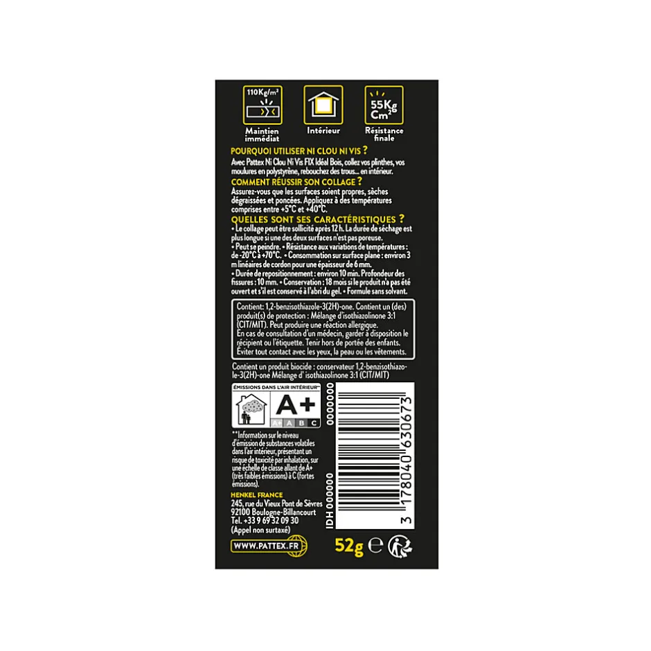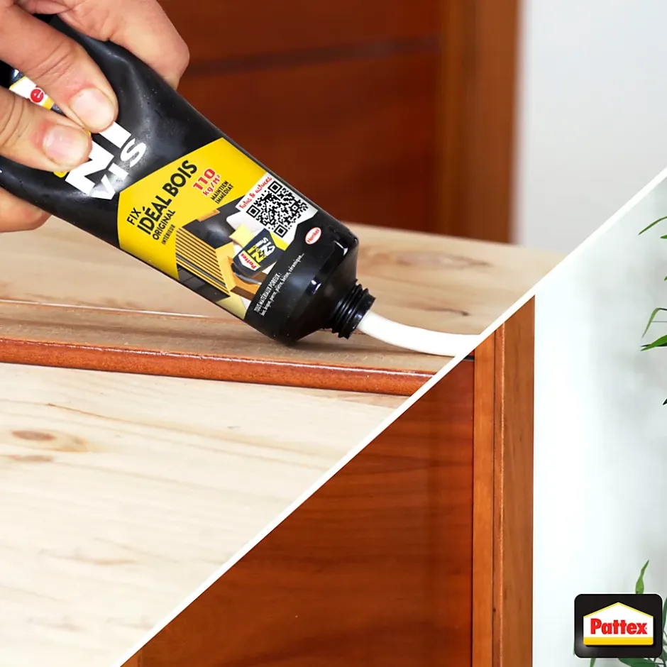 Pattex Colle de Fixation Ni Clou Ni Vis Fix Idéal Bois est une colle conçue pour un résultat fiable et rapide, sans percer. Pour des travaux en intérieur, pour un collage sur mur ou plafond, la colle de fixation Pattex Ni Clou Ni Vis Fix Idéal Bois vous assure une fixation puissante ! Cette colle sans solvant est idéale pour les matériaux poreux comme le bois, la brique, la pierre et le plâtre. Particulièrement efficace pour des applications en intérieur, elle assure un collage solide sur les matériaux lourds mais aussi sur les objets tels que les plinthes, patères, tasseaux, étagères, etc. Un des deux matériaux doit être poreux.