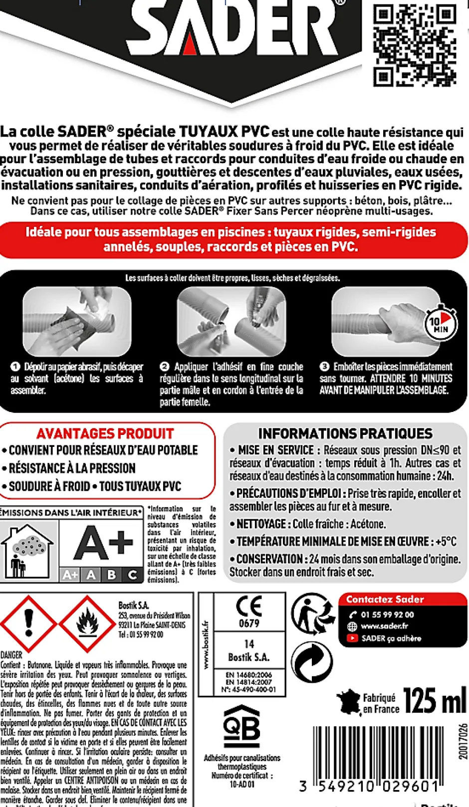 La colle SADER spéciale TUYAUX PVC est idéale pour l’assemblage de tubes et raccords pour conduites d’eau froide ou chaude en évacuation ou en pression, gouttières et descentes d’eaux pluviales, eaux usées, installations sanitaires, conduits d’aération, profilés et huisseries en PVC rigide. Tous assemblages en piscines : tuyaux rigides, semi-rigides annelés, souples, raccords et pièces en PVC.