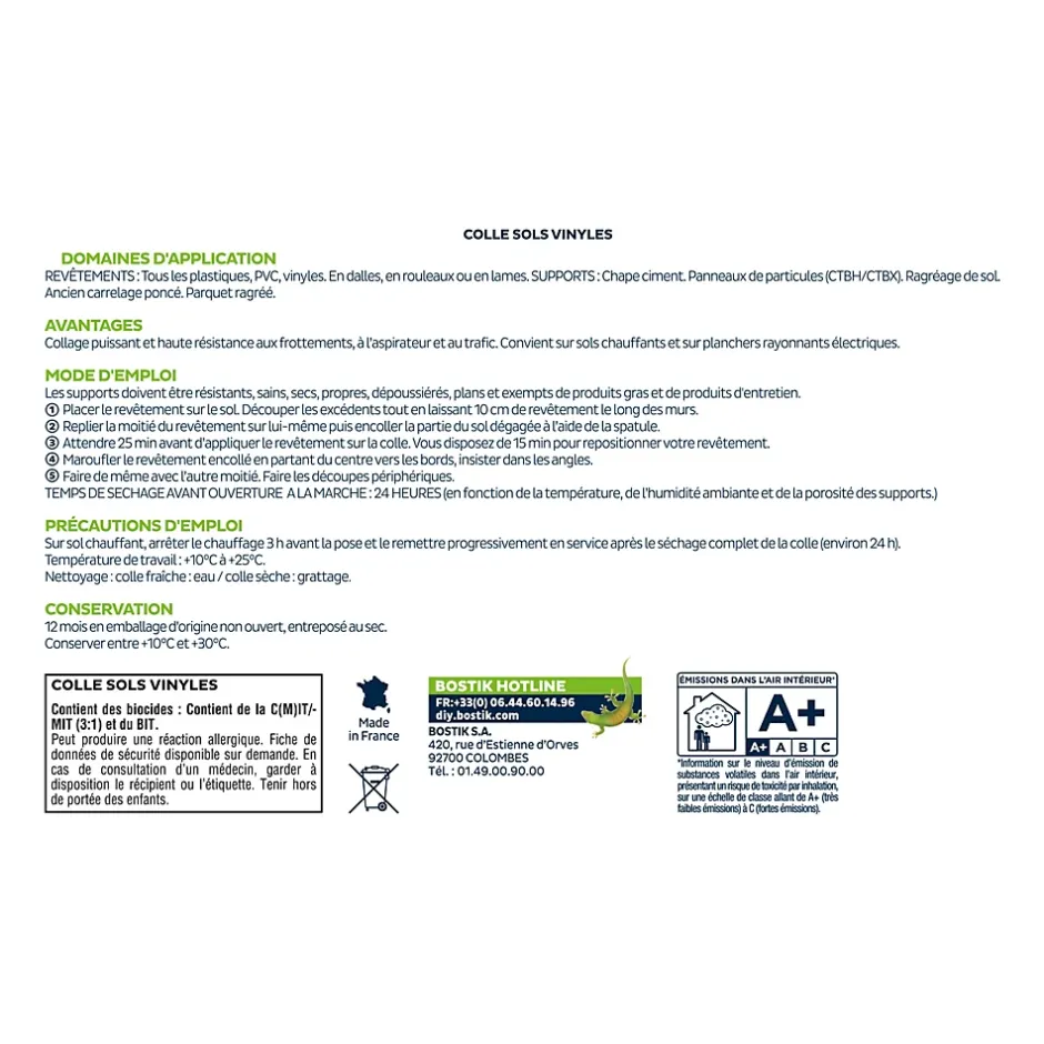 Découvrez la colle sols plastiques, PVC, vinyles Bostik, une colle acrylique haute performance conçue pour tous vos travaux de pose de revêtements de sol en dalles, rouleaux ou lames. Sa formule fluide permet une application facile au rouleau ou à la spatule, avec un gain de temps et de confort notable. L’application au rouleau permet de traiter jusqu’à 50 % de surface en plus par rapport à une application classique à la spatule. Cette colle est idéale pour tous types de sols plastiques, PVC et vinyles, et s’applique sur chape ciment, ragréage, panneaux CTBH/CTBX, anciens carrelages ou parquets ragréés. Elle garantit un collage puissant, durable et résistant aux frottements, à l’aspirateur et au trafic. Sans solvant et sans odeur, elle convient également aux sols chauffants et planchers rayonnants électriques. Le temps de travail est confortable : 5 à 10 minutes de temps de gommage, et jusqu’à 25 minutes pour repositionner les revêtements. Le séchage complet avant ouverture à la marche est de 12 heures. La consommation varie entre 200 et 250 g/m² selon l’outil utilisé (rouleau ou spatule). Nettoyage à l’eau pour la colle fraîche, grattage pour les résidus secs.