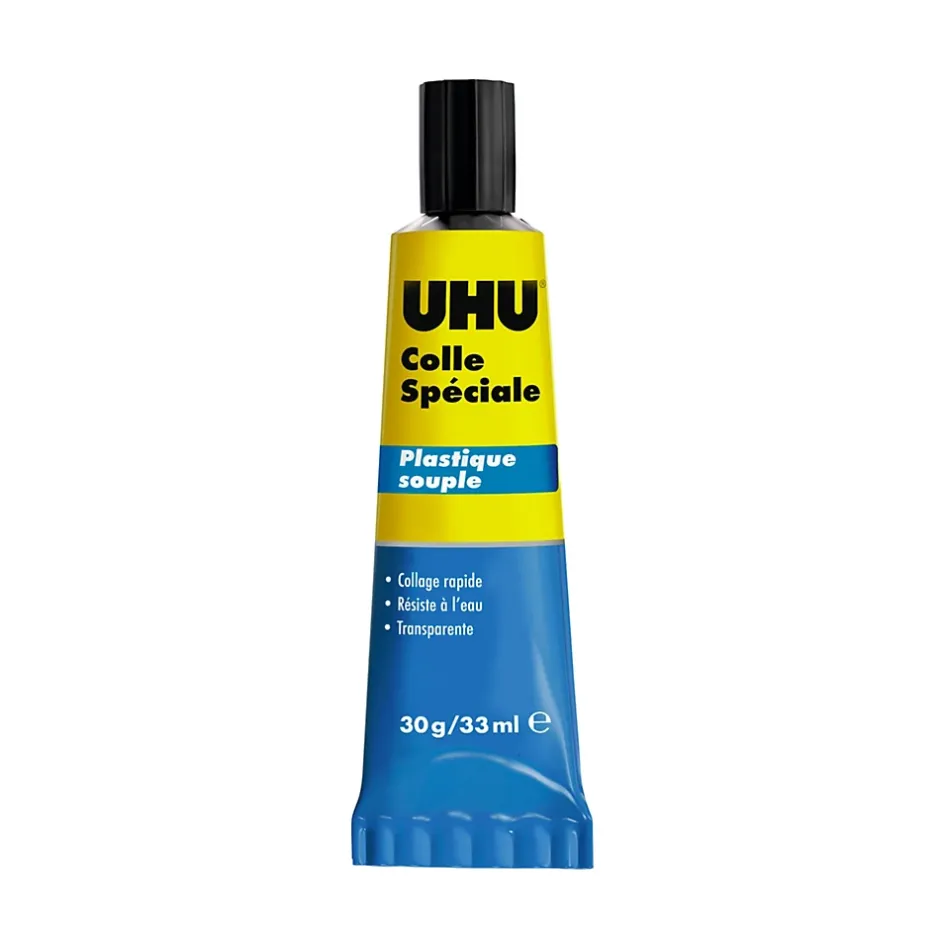 UHU colle spéciale plastique souple est transparente et idéale pour coller et réparer toutes les matières plastiques souples telles qu’une bouée, une piscine gonflable, les bateaux pneumatiques, les matelas gonflable, les imperméables, les bottes de pluie ect.Elle bénéficie d’une adhérence exceptionnelle et ne devient pas cassante. Résiste aux UV, à des températures entre -30°C et +70°C, ainsi qu’à l’huile, à l’eau, à l’alcool et aux acides et aux bases diluées.Résiste à l’eau, à l’huile et aux acides et aux bases diluées.Mode d’emploi : 1. Les surfaces doivent être propres, sèches et non grasses. 2. Appliquer sur une des surfaces (sur les 2 surfaces si elles sont poreuses ou rugueuses). 3. Joindre immédiatement les 2 surfaces. 4. Maintenir fermement les 2 surfaces entre elles. Conseil : Quand il s’agit de surfaces dures non poreuses, laisser sécher pendant 3-4mn. Appliquer une seconde couche de colle sur un côté, et joindre – fixer brièvement. Rigidité initiale après env. 5 mn, fixation définitive après 24 heures. Indications particulières : Pour les plastiques fins, appliquer seulement une couche mince (danger de déformation). Ne pas essuyer la colle restante, mais l’enlever une fois sèche. Conserver dans un milieu sec.