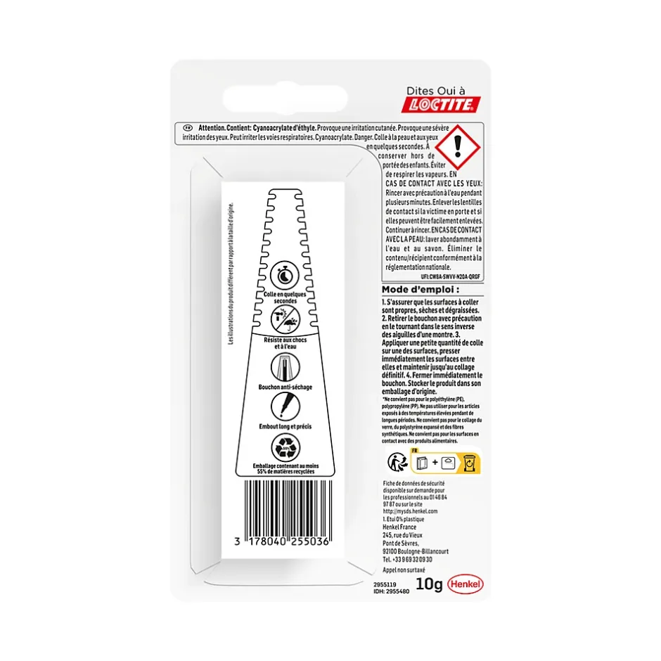 La colle polyvalente Loctite Super Glue-3 Précision : un collage précis grâce à son embout long ! Effectuer des travaux de réparations n’a jamais été aussi simple qu’avec la Super Glue-3 Précision de Loctite. Cette colle super forte convient à la plupart des matériaux* tels que la porcelaine, la céramique, les métaux, le plastique, le cuir, le caoutchouc, le bois, le carton, le papier, le tissu, etc. Résistante à l’eau et au lave-vaisselle, elle est idéale pour la réparation de vases, bibelots, bijoux fantaisie, prises électriques, semelles de chaussures, cadres et bien plus encore. Doté d’un embout long et précis, le flacon de colle permet une application précise goutte à goutte et d’accéder aux endroits difficiles. 1Ne convient pas pour le polyéthylène (PE), polypropylène (PP) et le polytétrafluoroéthylène (PTFE).