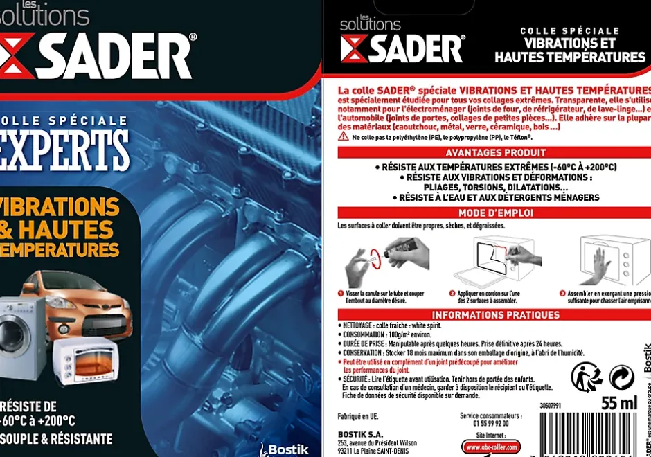 La Colle Sader Spéciale Vibrations et Hautes Températures est spécialement étudiée pour tous vos collages extrêmes. Transparente, elle s’utilise notamment pour l’électroménager (joints de four, de réfrigérateur, de lave-linge…) et l’automobile (joint de portes, collages de petites pièces…).