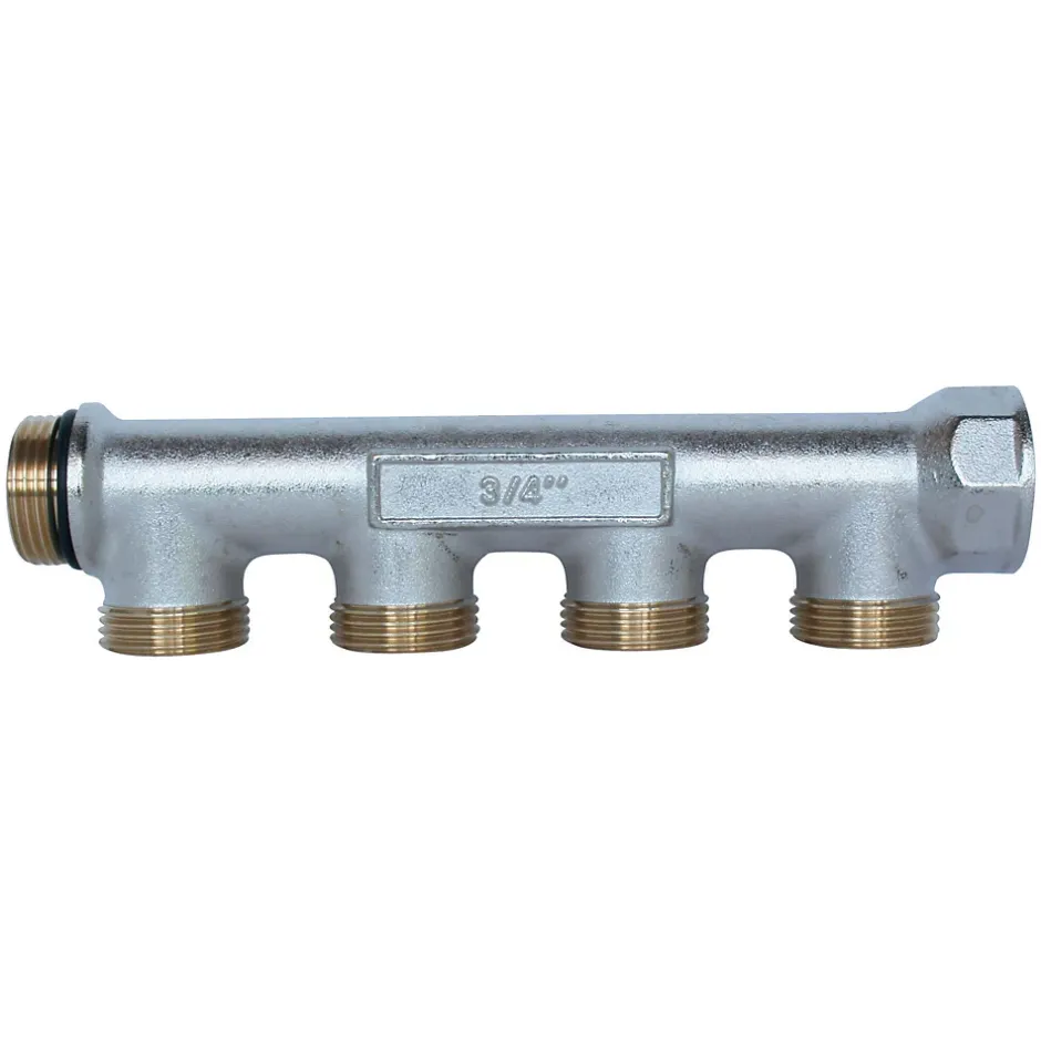 Collecteur sanitaire en laiton nickelé. Ce collecteur permet une alimentation sanitaire, dans une habitation, à partir d’un point central (distribution en pieuvre). Entrée et sortie du collecteur en Male-Femelle 3/4″ – système auto-étanche avec un alignement parfait, 4 dérivations en Male 3/4 Ek – Entraxe des dérivations : 40 mm