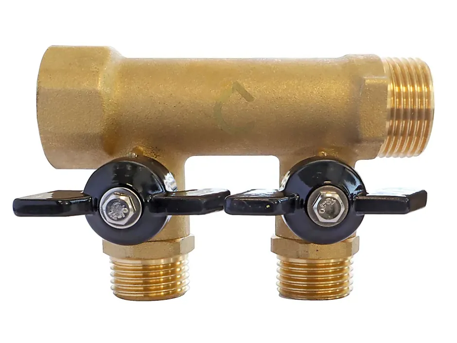 Collecteur laiton avec mini-vannes intégrées 2 départs M15/21 – Entrée F20/27 – Sortie M20/27 Somatherm for you