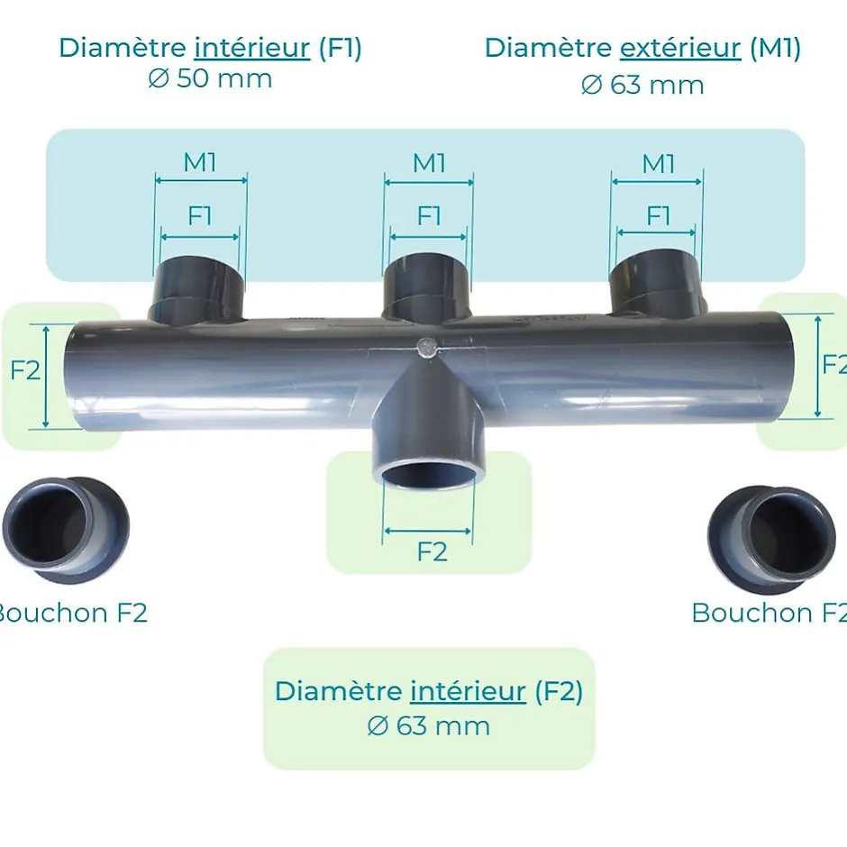 PVC pression à coller PN16 / Pression 16 bars.Collecteur avec deux bouchons de sortieLes collecteurs peuvent recevoir un coude ou un té supplémentaire pour augmenter le nombre d’aspirations