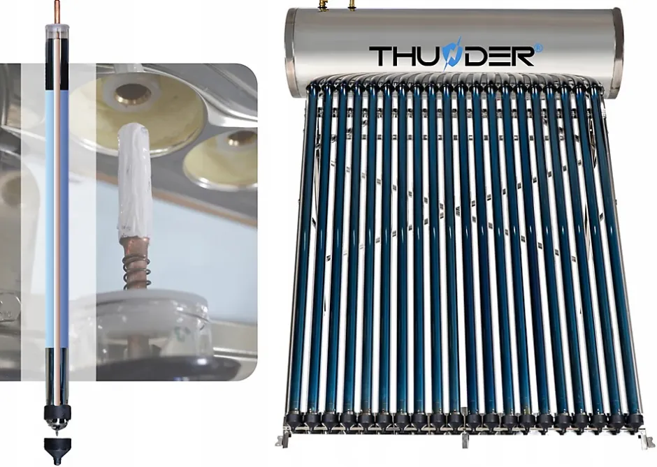 Efficace collecteur pressurisé THUNDER 200L avec 20 tubes sousvide, réservoir en acier inoxydable et intégrée résistance 1500W. Permet économiser énergie, assurant chaude eau pendant tout an.