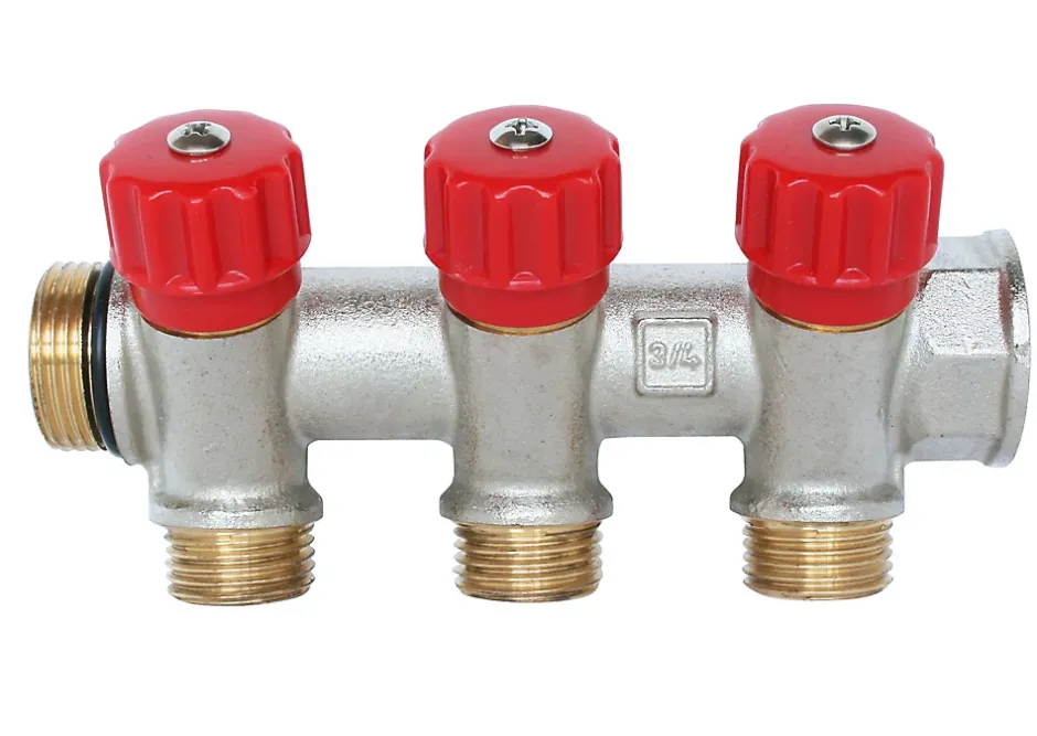 Collecteur sanitaire laiton nickelé M20/F27 – 3 dérivations à portée + vanne d’arrêt à clapet M15/21 Somatherm for you