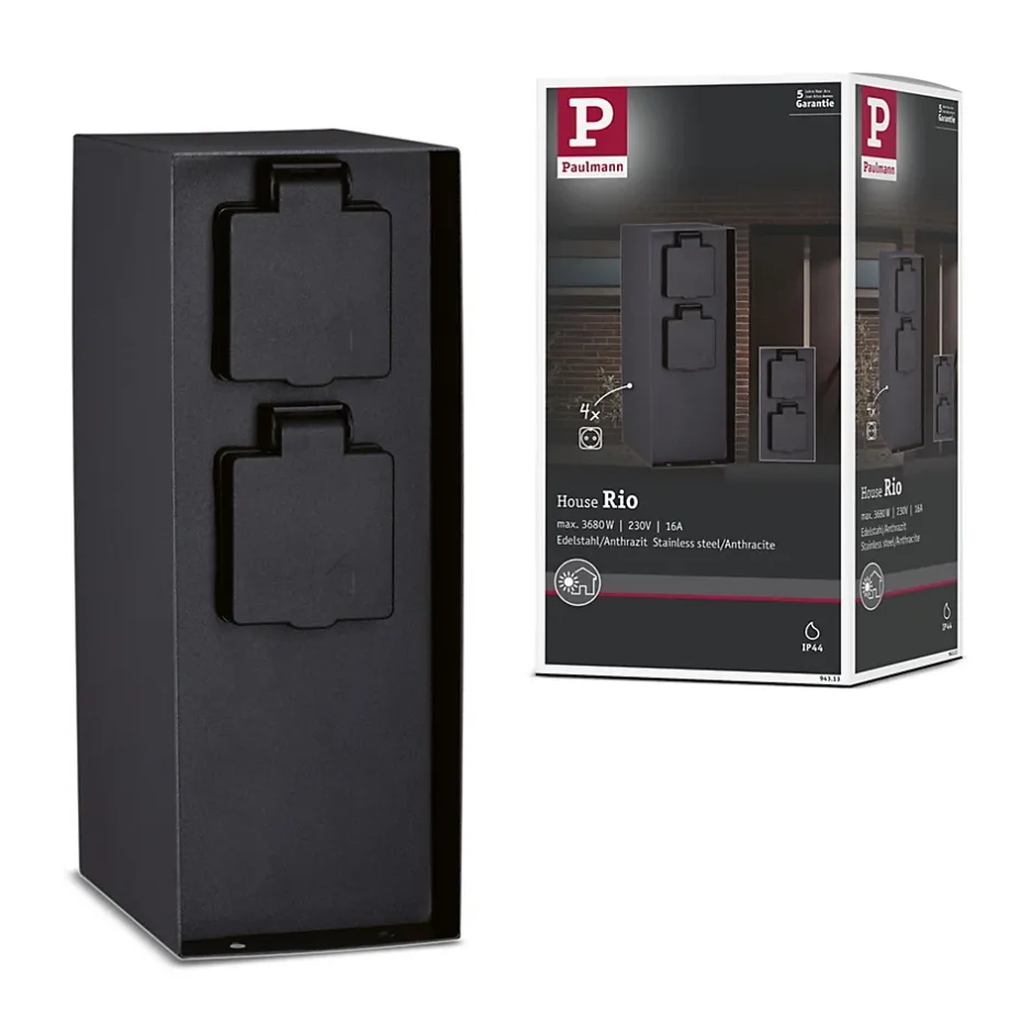 La colonne de prises Rio alimente l’espace extérieur en électricité. La protection anti-projections d’eau IP44 et les prises de terre en font un outil parfait pour alimenter en électricité l’éclairage de jardin. Les prises sont câblées en parallèle.