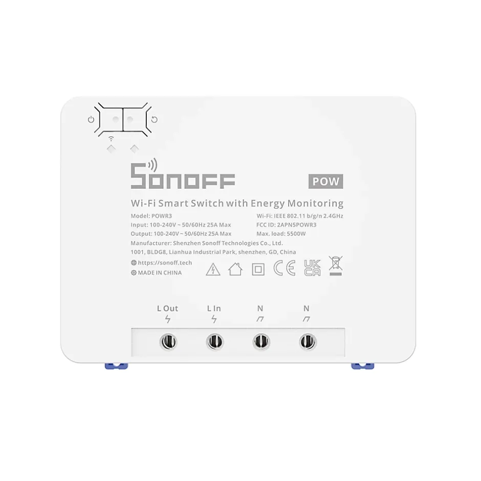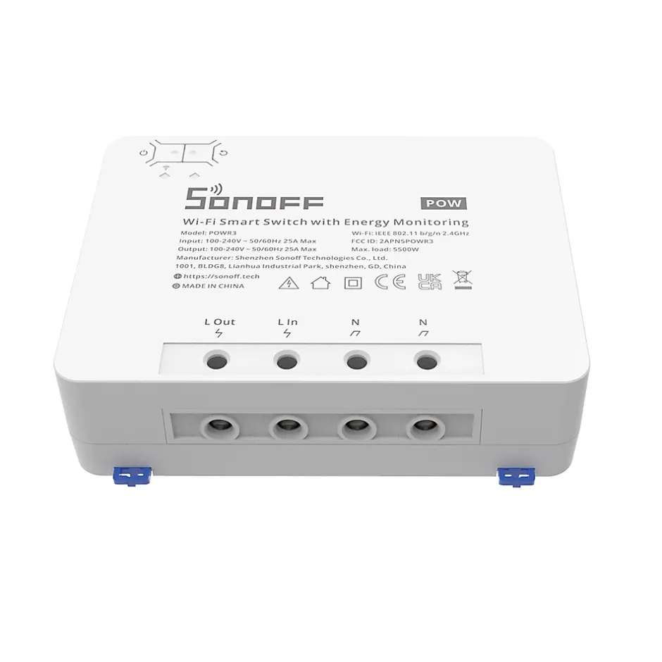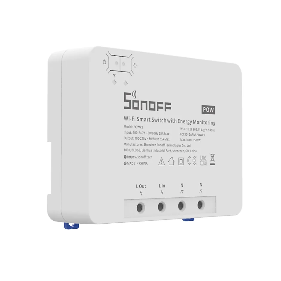 Commutateur intelligent WiFi – POWR3 – SONOFFVous avez toujours rêvé de transformer votre maison en un lieu intelligent ? Le POWR3 de la marque SONOFF vous rendra la vie quotidienne plus facile que jamais. Ce commutateur intelligent WiFi vous permettra non seulement de contrôler un dispositif à forte charge installé dans votre maison, mais aussi de mesurer sa consommation énergétique. Parmi l’un des grands avantages de ce modèle, sa puissance élevée par rapport à l’ancien modèle POWR2. Son courant de charge augmente en effet de 15A à 25A. Quant à sa puissance, elle atteint 5500W.À l’aide d’une simple commande vocale, vous pourrez désormais demander à l’assistant virtuel d’Amazon Alexa ou à Google Home Assistant d’allumer ou d’éteindre tous les appareils via votre téléphone. De plus, cet appareil vous offre la possibilité de programmer l’arrêt ou le démarrage automatique des appareils à votre convenance, selon l’horaire que vous choisissez.Il agit comme un compteur intelligent et vous informe sur votre consommation électrique. Cette version est capable de stocker les données de votre consommation électrique pendant 100 jours. L’historique peut être par la suite exporté au format CSV sur votre téléphone.Comme le POWR3 prend en charge l’énergie intelligente Alexa, vous pouvez afficher la consommation d’énergie globale ou individuelle de l’appareil de manière centralisée dans le tableau de bord Alexa Energy.Protégé contre les surcharges, l’alimentation sera coupée automatiquement dès qu’une anomalie est détectée.Caractéristiques principales : Type de produit : Commutateur intelligent Wi-Fi avec surveillance de l’alimentationTension d’entrée : 100-240V CATension de sortie : 100-240V CACharge max. : 25A/5500WMatériel : PC V0Conformité certifiée : CE, FCCPoids : 528gCompatible avec : Amazon Alexa, Assistant Google, Smartthings