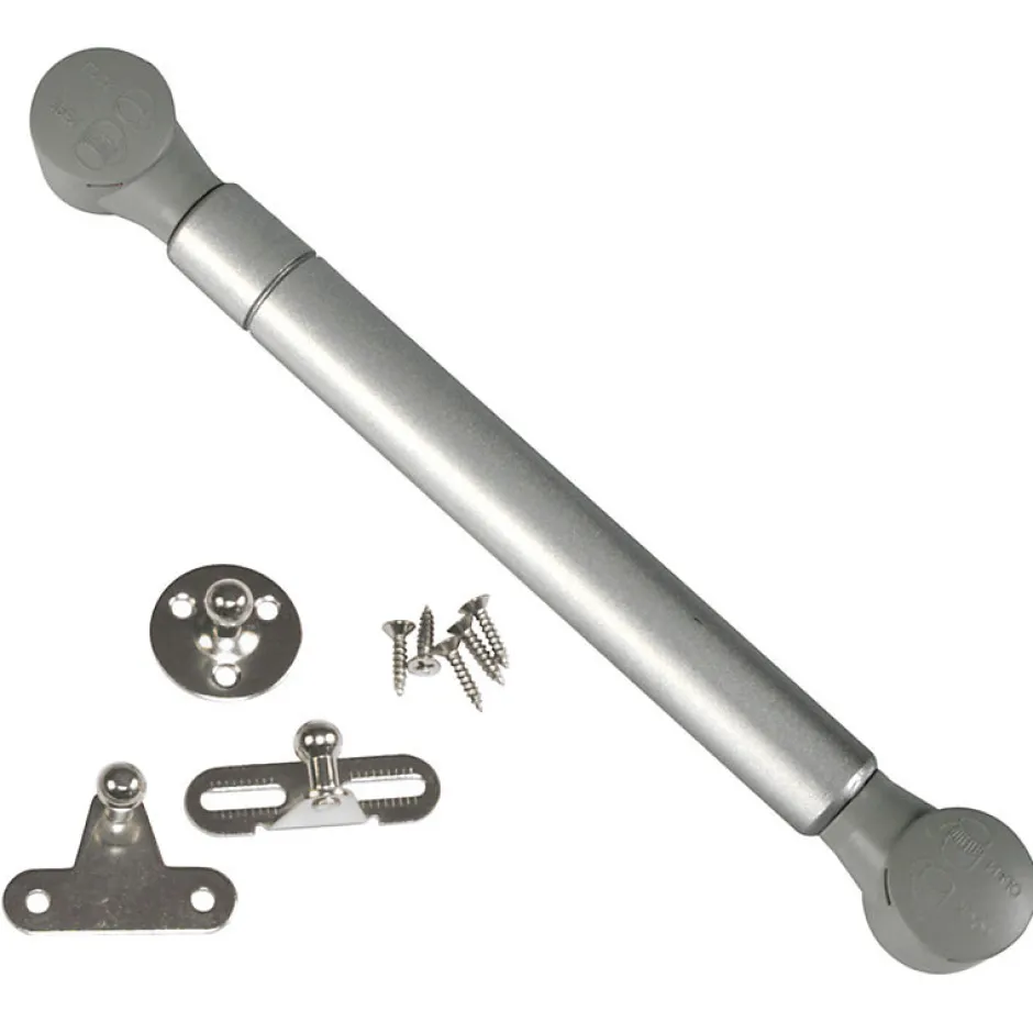 Compas à gaz fermé. Pour les portes battantes à ouverture descendant. Le vantail est positionné à 80°, 90° ou 100° en fonction de la taille et du poids. Inclus les supports de fixation pour le bois et l’aluminium. Compas à gaz pour portes battantes de meubles. Fabriqué en acier et en polypropylène gris aux extrémités. Avec fonction d’ouverture vers le bas. Le vantail est positionné à 80°, 90° ou 100° en fonction de la taille et du poids du vantail. Capacité de charge : 12 kg. Les supports de fixation pour le bois et l’aluminium sont inclus.