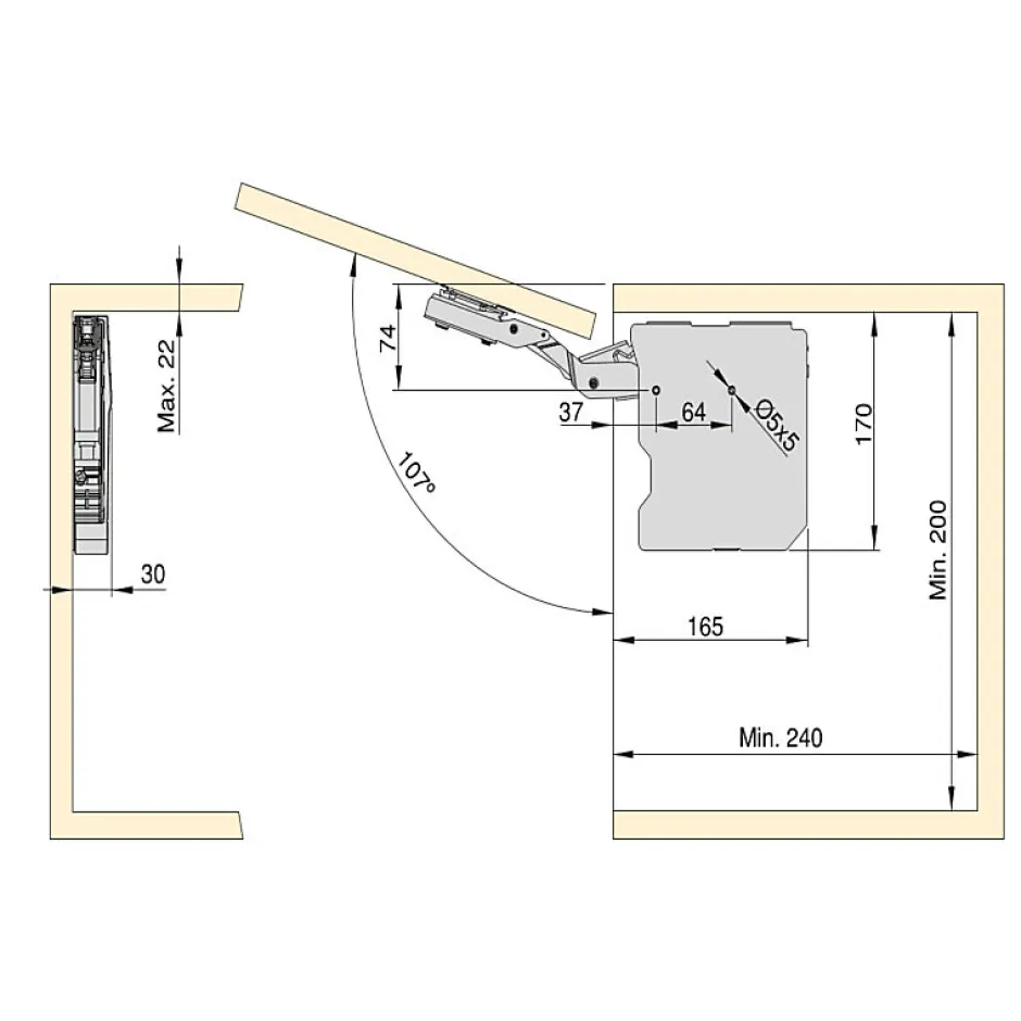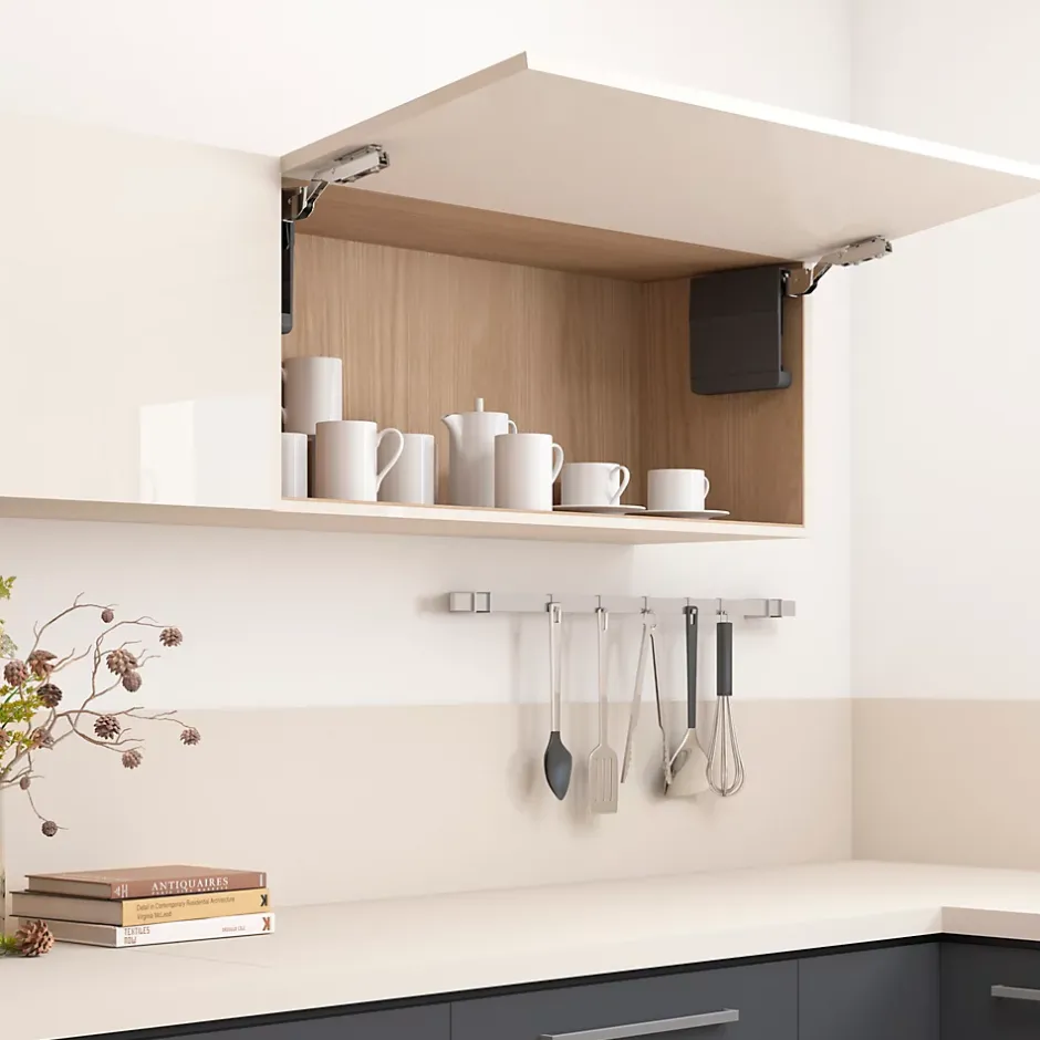 Système de compas pour portes relevables de meubles de cuisine et habitat, fonctionnement souple et précis sans charnières. Angle d’ouverture 107°, largeur caisson jusqu’à 1200 mm, hauteur 250-600 mm, épaisseur panneaux 16-22 mm. Comprend crochets, vis, cache, gabarit de marquage pour installation facile et précise.