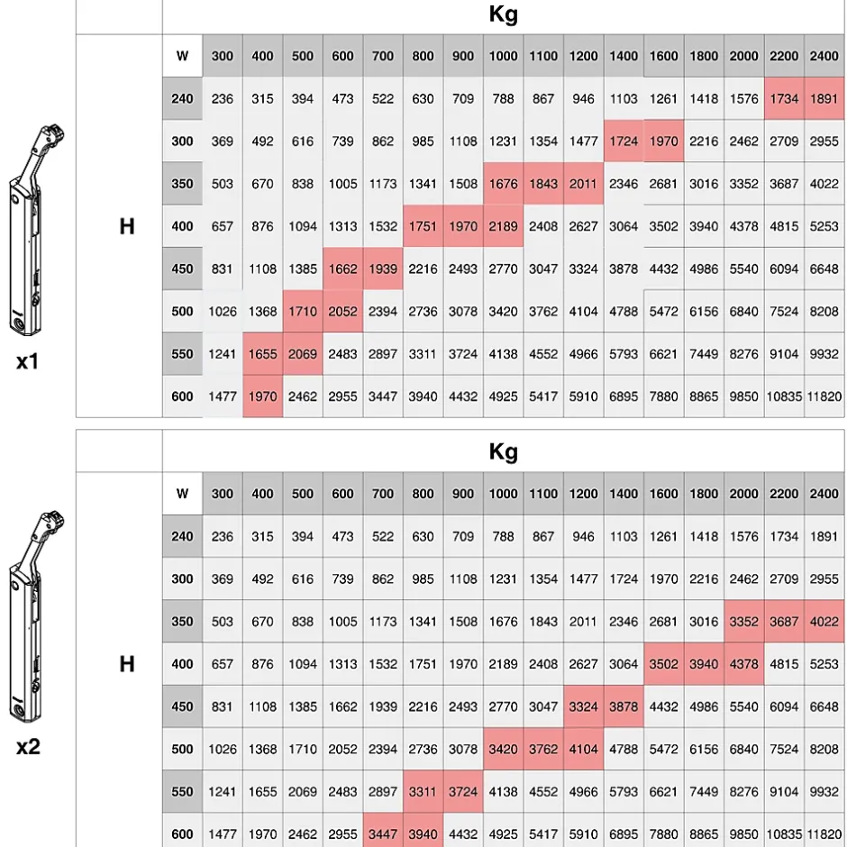 - Fonctionnement fluide et sans chocs ; recommandé d’associer à des charnières soft-close pour une fermeture silencieuse.