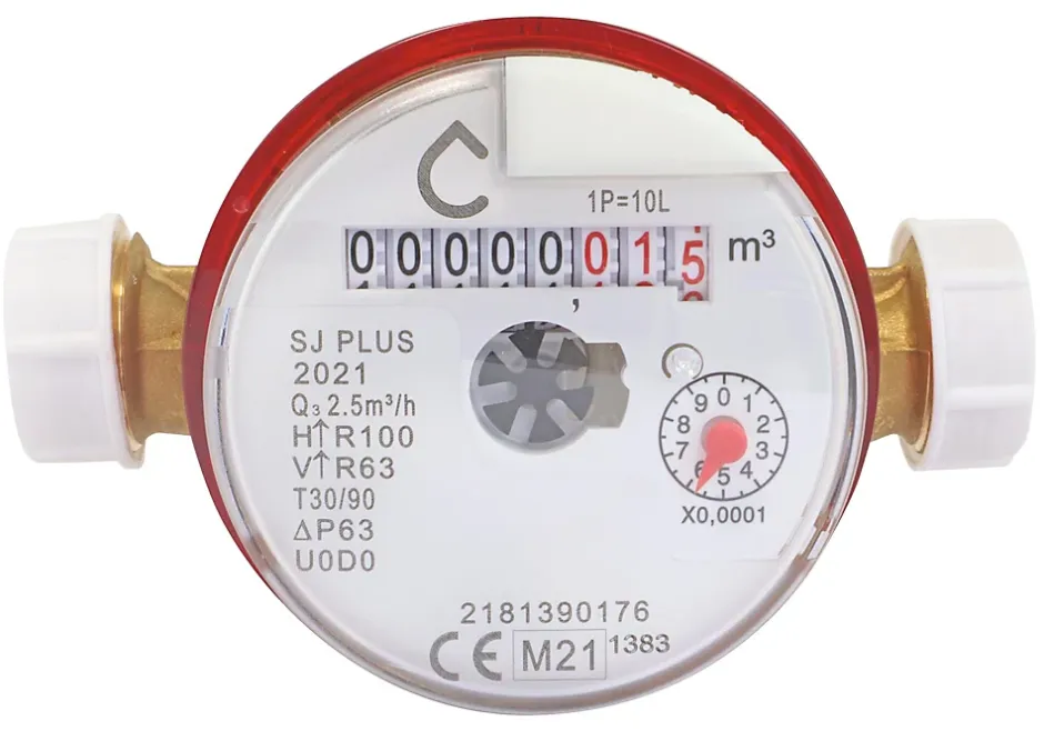 - Lecture directe sur 8 rouleaux numérotés (5 rouleaux noirs pour les m3 et 3 rouleaux rouges + 1 aiguille pour les dizièmes de litre).