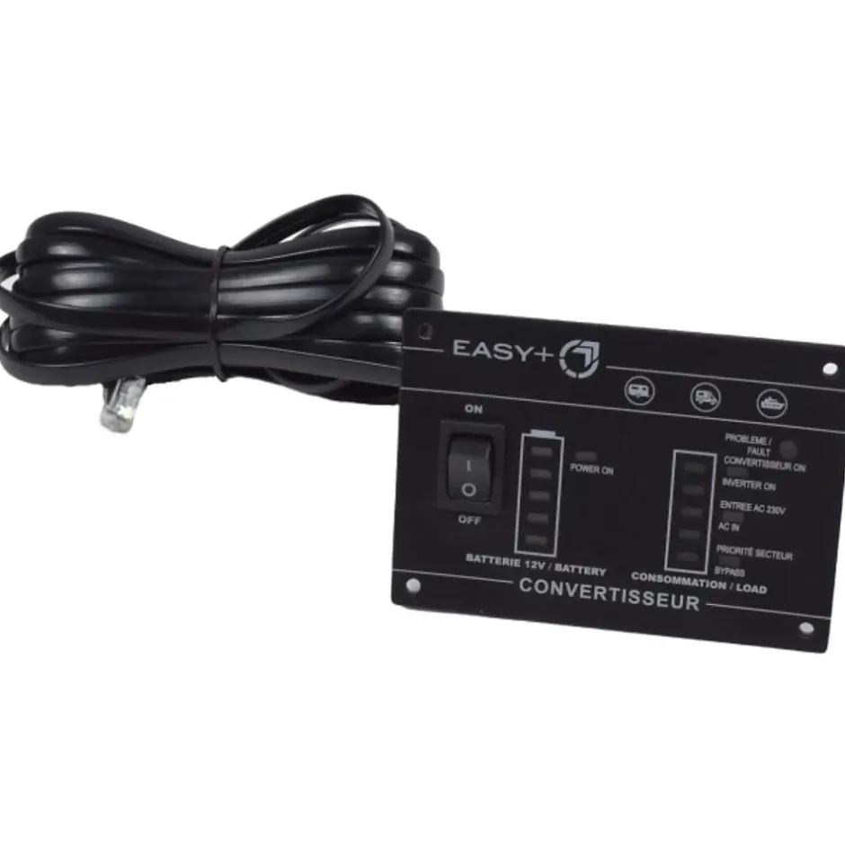 Convertisseur EASY+ 2000 W• Convertisseur PUR-SINUS• Puissance de sortie 2000W en continu• Priorité de commutation sur le 230 V intégrée• Livré avec une commande déportée• Puissance en pic (1 s) 3900W• Connectiques fournies de 35mm²Dimensions : 44,5 x 22,1 x 9 cm