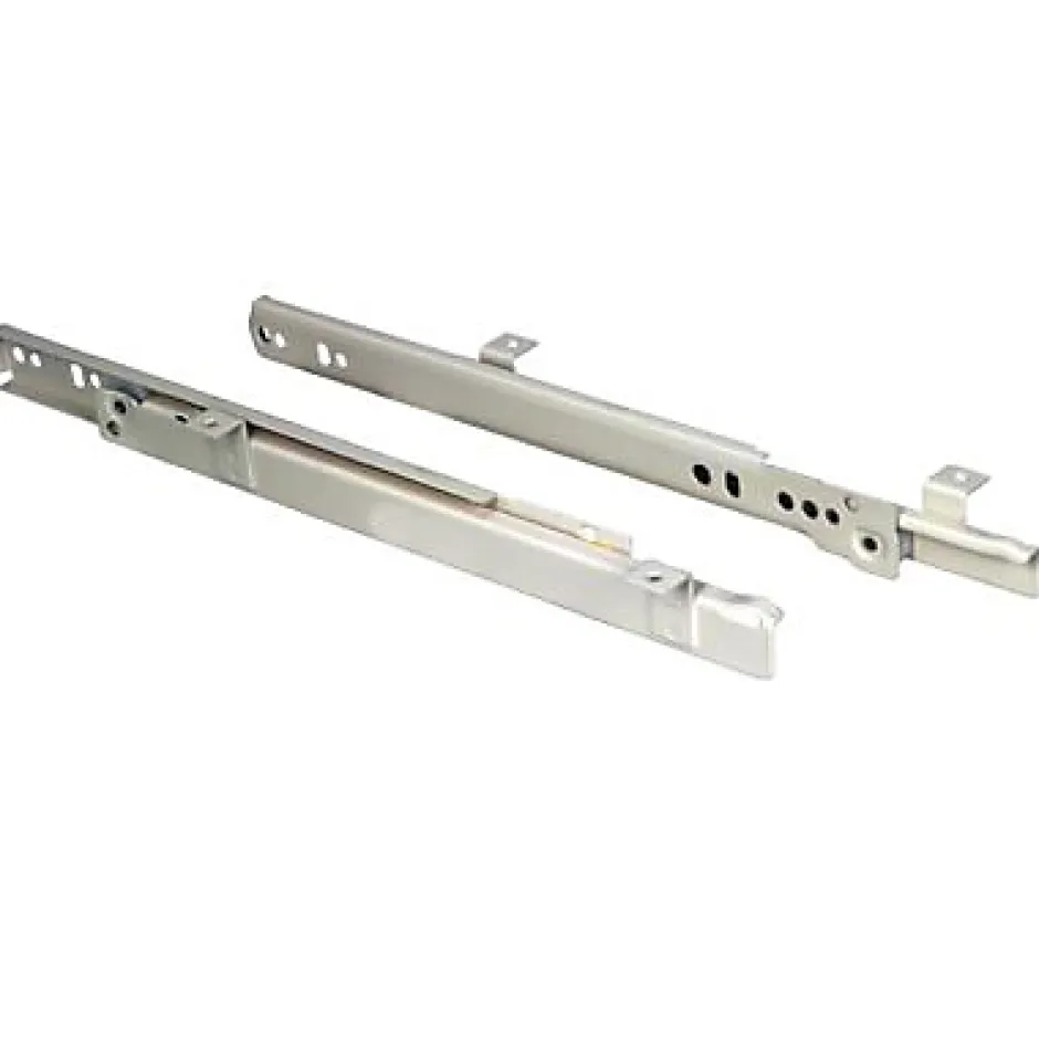 Coulisse à galets à sortie partielle. Pour tablette coulissante. Pose sous la tablette. Acier époxy beige. Epaisseur 12mm. Longeur de la coulisse 500mm.