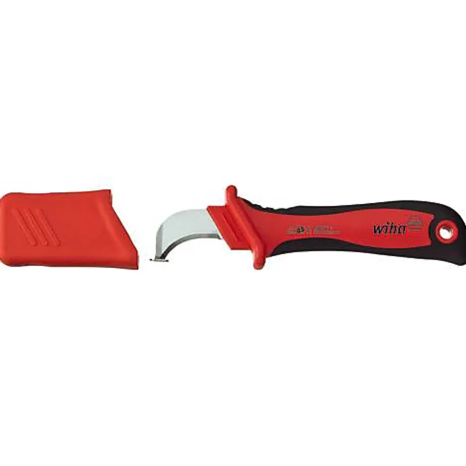 Couteau à dénuder Wiha neu 36053 pour câbles ronds, 200 mm, alliant sécurité et précision. Lame inox trempé en forme de crochet pour un dégainage net, poignée multicomposite isolée et capuchon de protection pour un transport sûr. Conforme IEC 60900:2004, utilisable jusqu’à 1000 V AC, idéal pour travaux sur câbles ronds épais.