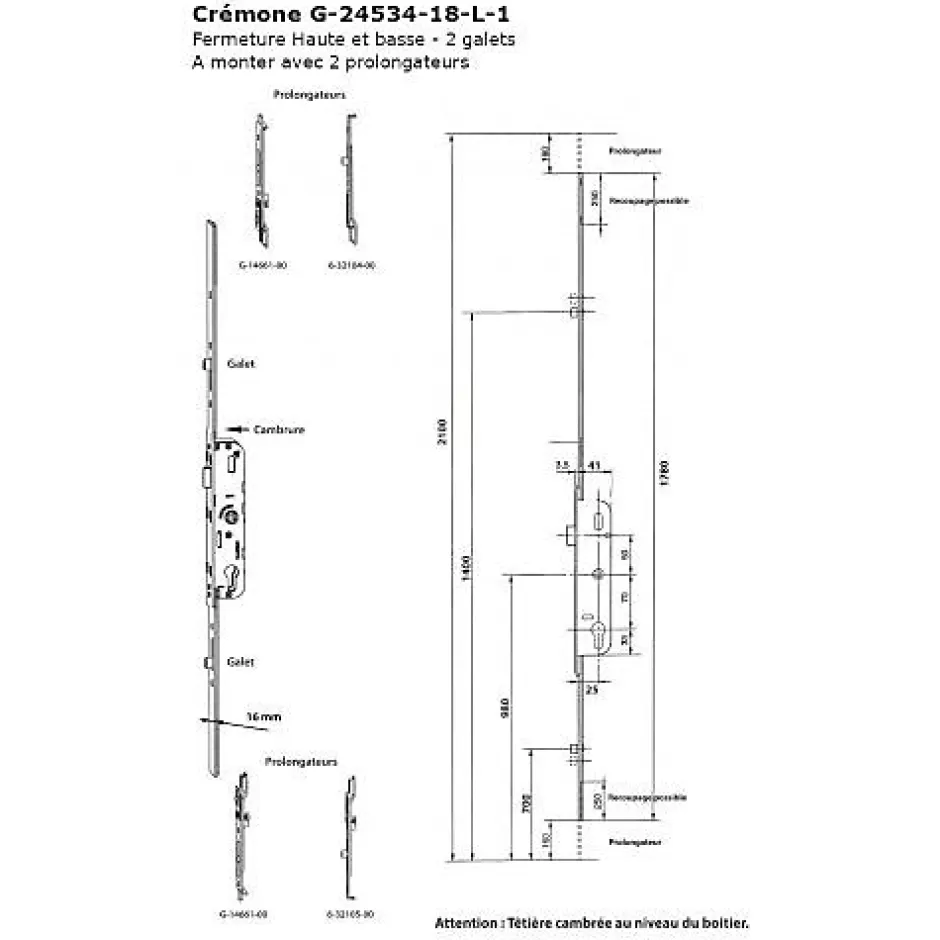 - Longueur totale 2030 mm avec crémone active 1530 mm et compatibilité avec prolongateurs référencés