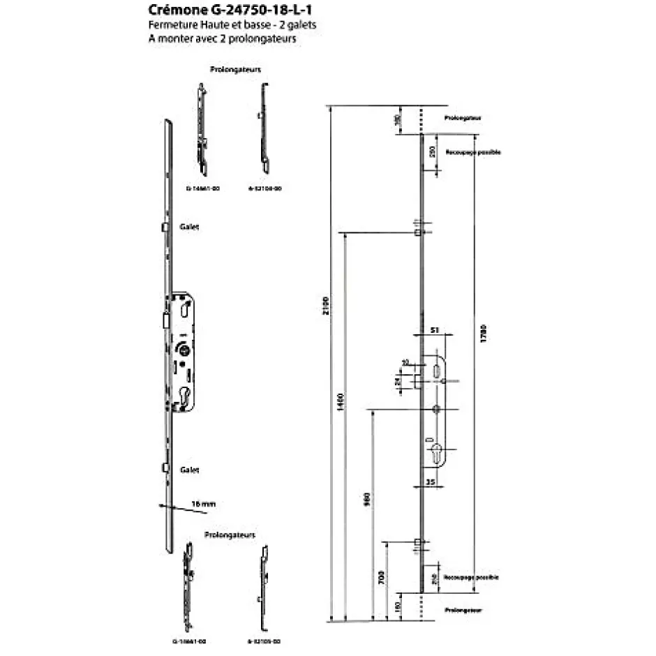 - Longueur totale 1780 mm (crémone 1530 mm), têtière 16 x 2,5 mm, carré 7 mm, entraxe 70 mm, réversible droite/gauche.